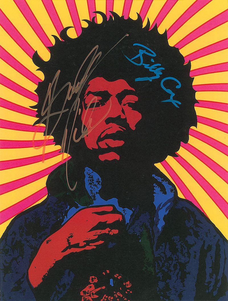 Color 11 x 14 cardstock photo featuring a ‘psychedelic’ image of Hendrix, signed in blue ink by Billy Cox and in orange ink by Buddy Miles. In fine condition.