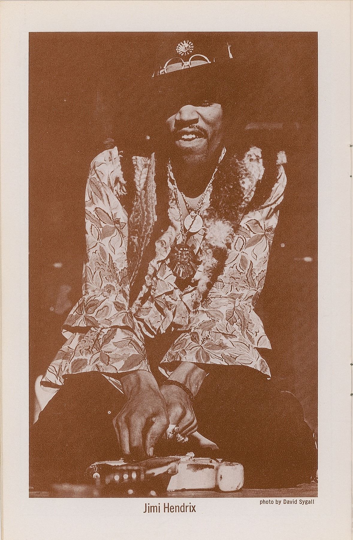 Rare concert program for Jimi Hendrix: A Band of Gypsys at the Fillmore East, New York, on December 31, 1969, and January 1, 1970, featuring full-page images of Hendrix and Buddy Miles. Program also includes information for the Grateful Dead show on January 2-3. In fine condition. This program is for the only full concerts the Band of Gypsys ever played—two on December 31 and two on January 1—before disbanding at the end of the month. Recordings from these concerts formed the self-titled Band of Gypsys album, which was the last album he released before his death.