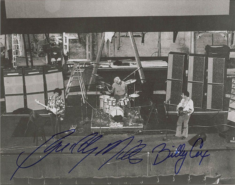 Glossy 14 x 11 photo of the Band of Gypsys doing a sound check before their 1970 New Year’s Eve show, with Jimi Hendrix on the left, signed in blue felt tip by band members Buddy Miles and Billy Cox. In fine condition, with a couple spots to the finish.