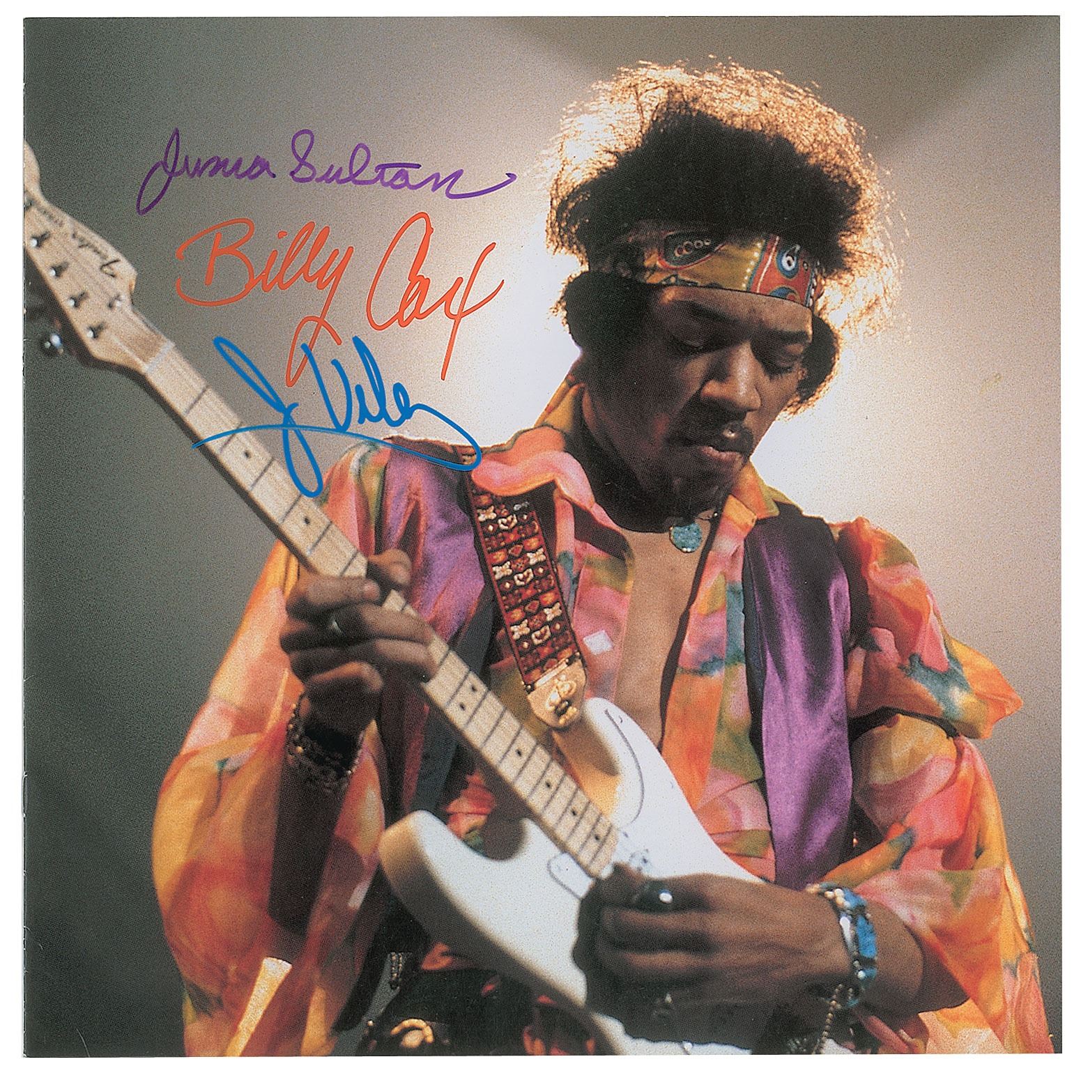 Booklet for the Jimi Hendrix compilation album South Saturn Delta, signed on the front cover in felt tip and paint pen by three musicians from the famous Woodstock set—Billy Cox, Juma Sultan, and Jerry Velez. In fine condition. The record is not included.