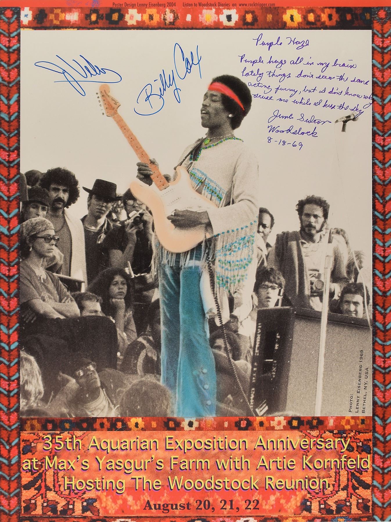 Uncommon color glossy 18 x 24 poster of Lenny Eisenberg's photo of Jimi Hendrix performing at Woodstock, signed by three musicians from that famous set—in blue felt tip by Jerry Velez and Billy Cox, and in purple felt tip by Juma Sultan, who adds lyrics to "Purple Haze." In very good to fine condition, with scattered light creases, one of which passes through Hendrix's face.