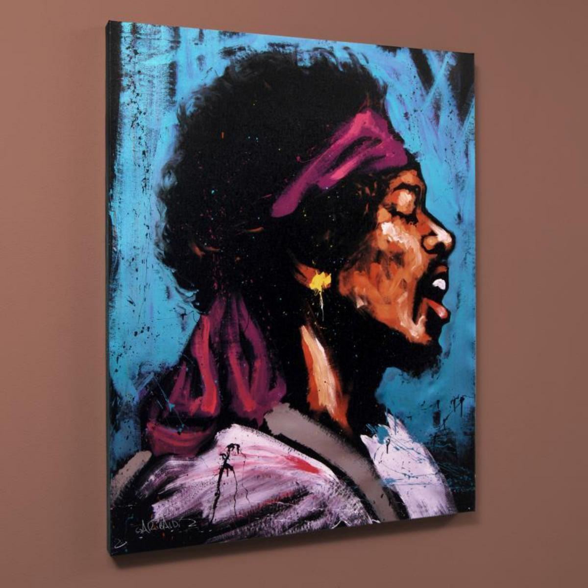 Combining his passions for music and art, David Garibaldi creates stunning visual poetry. "Jimi Hendrix (Bandana)" is a limited edition giclee on stretched canvas, numbered and bearing the artist's authorized signature. This piece comes gallery wrapped. Includes Letter of Authenticity. Measures approx. 28" x 35" (image). Reference #: 237409.
