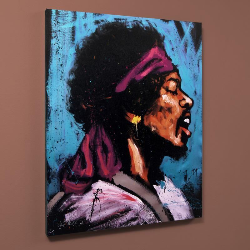 Combining his passions for music and art, David Garibaldi creates stunning visual poetry. "Jimi Hendrix (Bandana)" is a limited edition giclee on stretched canvas, numbered and bearing the artist's authorized signature. This piece comes gallery wrapped. Includes Letter of Authenticity. Measures approx. 28" x 35" (image).