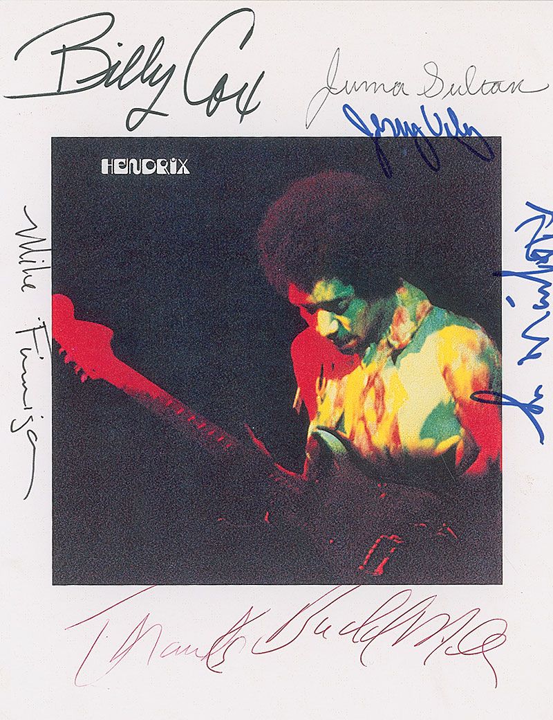 Color 8.5 x 11 laserprint photo of a Hendrix album cover, signed in ink and felt tip by Buddy Miles, Jerry Velez, Juma Sultan, Billy Cox, Lee Michaels, and Mike Finnigan. In fine condition.