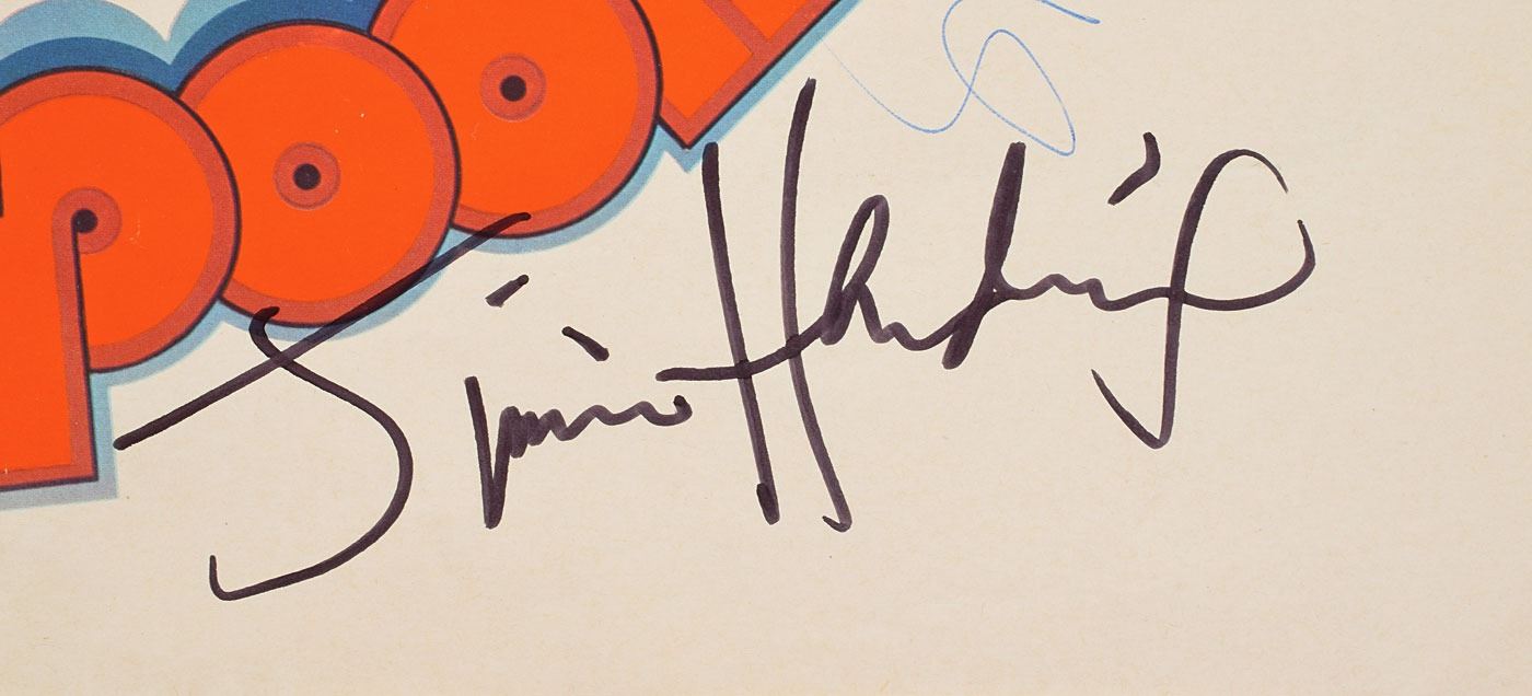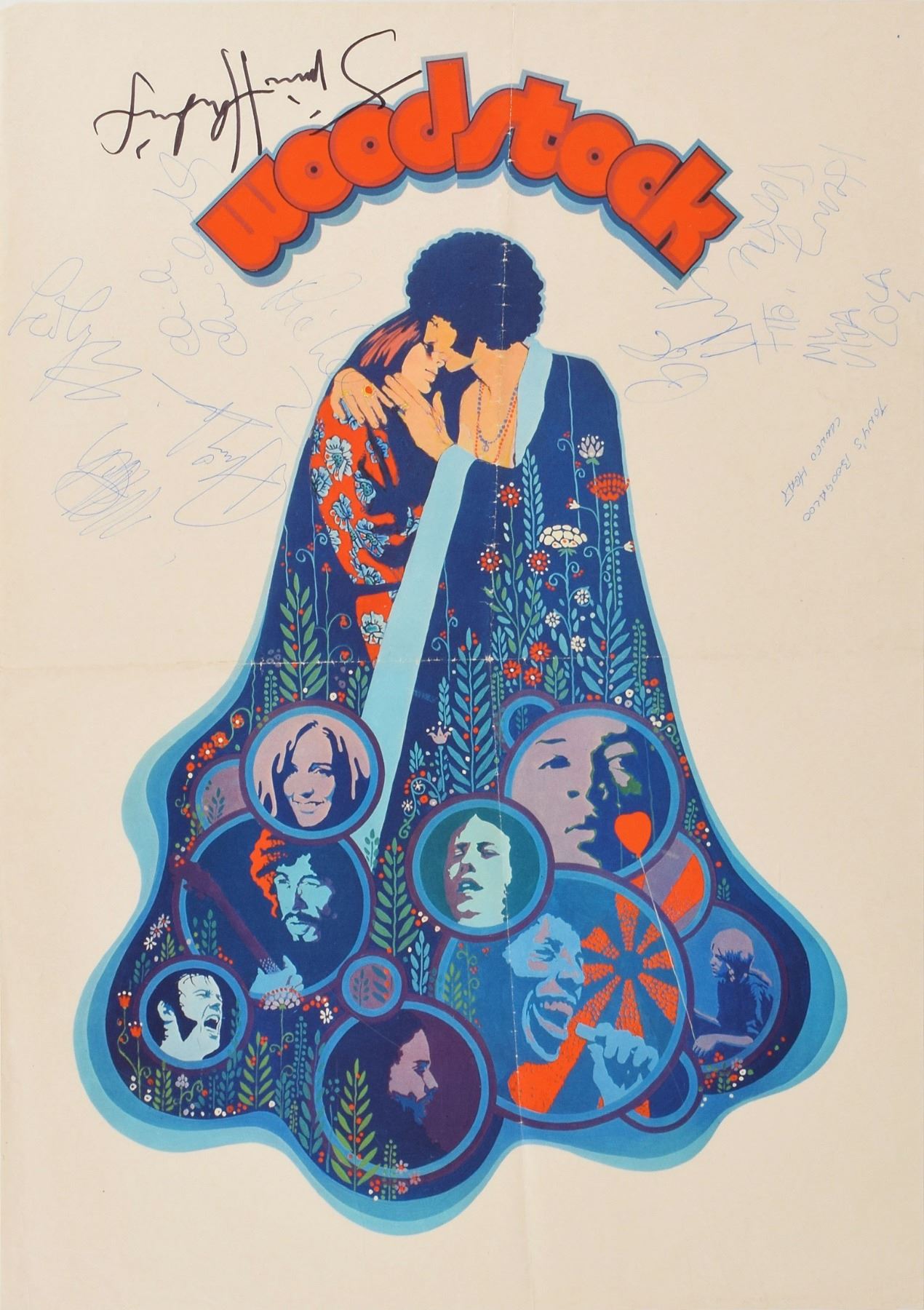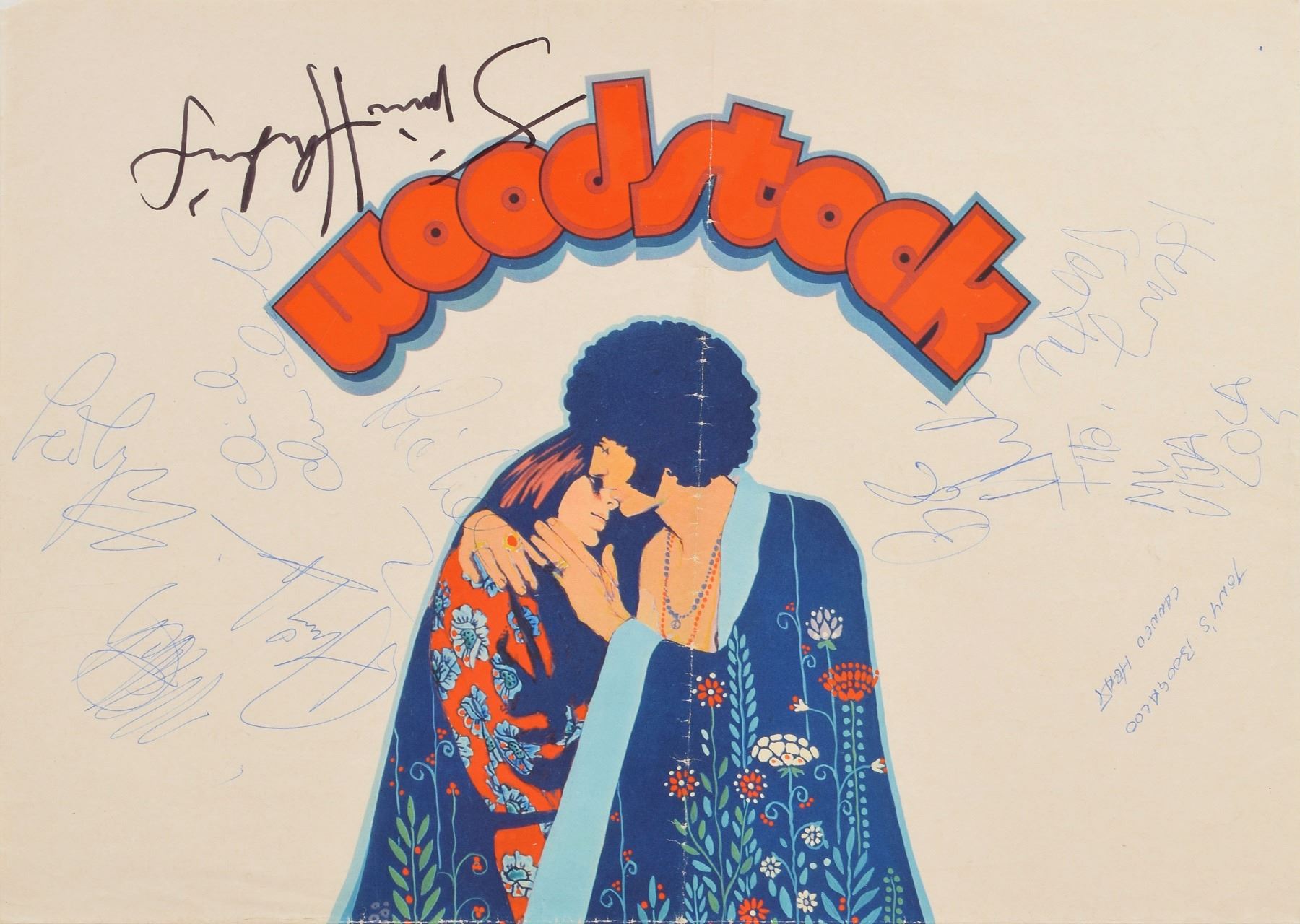 Amazing vintage color 16.5 x 23.5 poster for the legendary Woodstock Festival, depicting a man and woman in psychedelic embrace, their bodies extending into a mixture of flora and faces, signed upside-down in black felt tip, "Jimi Hendrix" and in blue ballpoint, "Mitch." Also signed in blue ballpoint by Ric Lee, Chick Churchill, Leo Lyons, and Alvin Lee of 10 Years After, and by Bob Hite, Henry Vestine, and Fito de la Parra of Canned Heat, with the latter adding "Mi Vida Loca." Also bears collector's ink notations. In very good to fine condition, with a few short edge tears, intersecting folds, and general light handling wear. Accompanied by a color 3.5 x 3.5 candid photo of Hendrix taken at the time of signing, as well as a photo booklet containing various candid photos of bands like Creedence Clearwater Revival and 10 Years After. Consignor notes that the Experience autographs were obtained at the Berlin Tempelhof Airport on September 4, 1970. At the time of singing, Hendrix and the Experience were wrapping up the European leg of their Cry of Love tour, playing with Canned Heat, Ten Years After, Procol Harum, and others on September 4th at the Deutschlandhalle for the one-day ‘Super Concert '70’ music festival. Hendrix last appeared on stage at Love & Peace Festival in Fehmarn, Germany, on September 6th, and he passed away just two weeks later on September 18, 1970, at the age of 27. A large, bold Hendrix signature on a beautiful vintage Woodstock poster—truly a must-have collector's item.