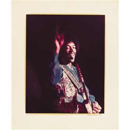 <B>Jimi Hendrix Color Photo by Jim Marshall.</B></I> A color 14.5" x 18" photo of Jimi Hendrix by legendary Rock and Roll photographer Jim Marshall, #20 in a limited edition of 20, signed and dated 1976 by Marshall, and matted to an overall size of 20" x 24". The photo is in Excellent condition; the matting bears a photographer stamp on the reverse and is Very Fine with some corner bumping and mild to moderate toning.<BR><BR><b>Shipping:</b> Flat Material, Large (<a target="_blank" href="http://www.heritageauctions.com/common/shipping.php">view shipping information</a>)