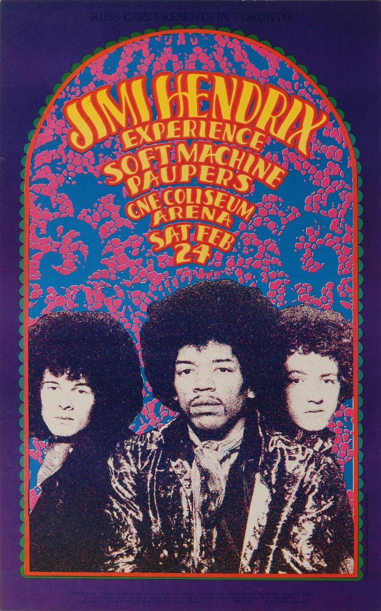 Stunning original color first printing 13 x 22 poster for the Jimi Hendrix Experience at the CNE Coliseum Arena in Toronto on February 24, 1968, featuring excellent artwork by Gary Grimshaw. Others on the bill are the Soft Machine and the Paupers. In fine condition. Remaining bright and colorful, this is a fantastic example of a classic Hendrix poster.