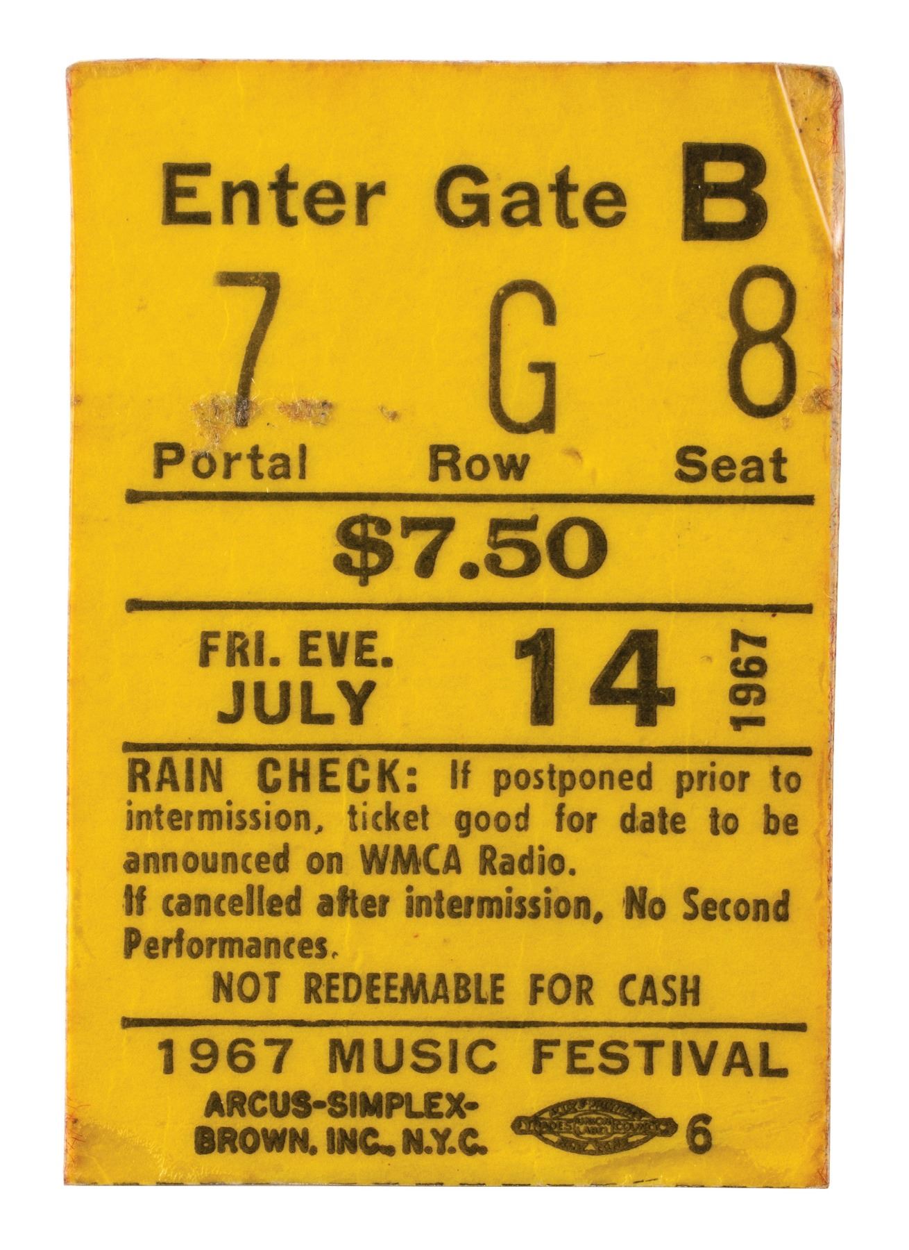 Rare 1.5 x 2 laminated ticket stub from a concert featuring the Monkees and headlined by the Jimi Hendrix Experience at Forest Hills Tennis Stadium in Queens, New York, on July 14, 1967, marked on the reverse in an unknown hand with the names of the Monkees band members. Also included is an ultra-rare matchbook advertising The Monkees' "First and Only N.Y. Appearance" at the Forest Hills Music Festival, July 14–16, 1967, with a full schedule of top-billed performers listed inside; and a 1967 Monkees US tour program. In overall very good condition, with aforementioned lamination and notations to ticket stub, wear to the used matchbook, and light creasing to the program.