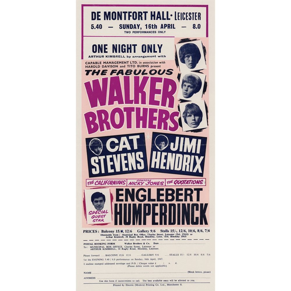 Vibrant original handbill, 5.25 x 11.5, promoting a concert featuring the Jimi Hendrix Experience, Cat Stevens, Engelbert Humperdinck, and the headline Walker Brothers at the De Montfort Hall in Leicester, England, on April 16, 1967. The handbill features ‘floating head’ images of the musicians and retains its postal booking form to the bottom. In fine condition, with a central horizontal fold. Accompanied by a certificate of authenticity from Tracks.