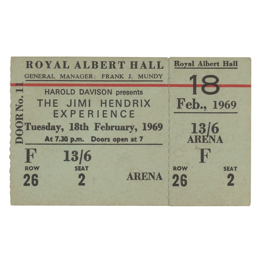 Original full 3.75 x 2.25 ticket for a concert headlined by “The Jimi Hendrix Experience” at London’s famed Royal Albert Hall on February 18, 1969, issued for Row 26 and Seat 2 in Section F. Included with the ticket is the corresponding original program, which was specially produced for the band’s performances at the Royal Albert Hall, 12 pages, 8.25 x 10, featuring images and information about the Experience, The Soft Machine, and Mason, Capaldi, Wood & Frog. In overall fine condition, with a light central vertical bend to the program. The Jimi Hendrix Experience's two gigs at the Royal Albert Hall, on February 18 and 24, 1969, were their first and final headline performances at the iconic venue.
