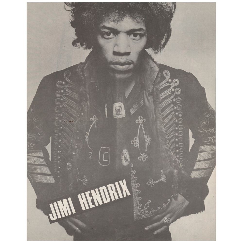 Uncommon 6 x 9.5 concert program for the Jimi Hendrix Experience at the Saville Theatre in London, England, on August 27, 1967, which was Hendrix’s fourth show at the Saville, and featured openers The Crying Shames, The Crazy World of Arthur Brown, and Tomorrow (featuring Keith West and future Yes guitarist Steve Howe). The late show was canceled out of respect for Brian Epstein, the Beatles manager and the producer of these Jimi Hendrix Saville Theatre concerts, when news spread to the Saville of his passing. The program contains large images of the scheduled acts, and the covers bear vibrant psychedelic cover artwork by Simon and Marijke. In near mint condition.