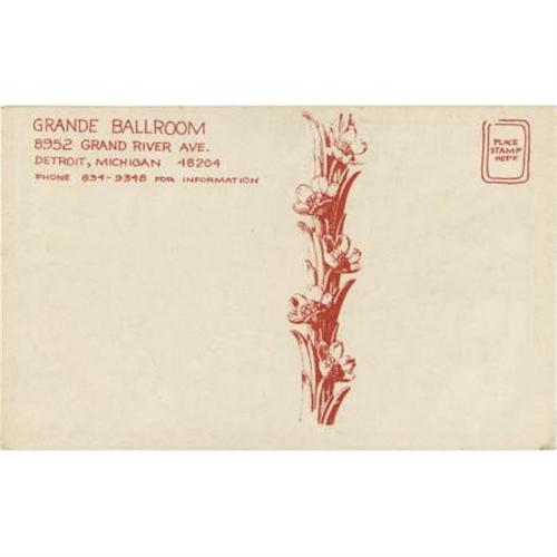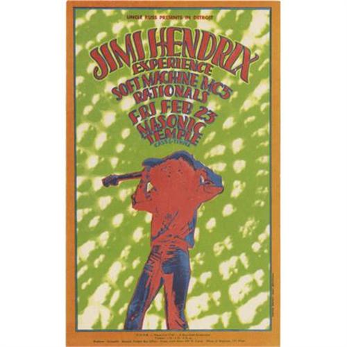 <B>Jimi Hendrix Experience Masonic Temple Concert (Russ Gibb, 1968).</B></I> One of the best of the Detroit postcard designs decorates this item. It's by Gary Grimshaw, and is one of the most colorful and psychedelic designs of the era. Featured with Jimi were Brits, The Soft Machine, plus local favorites, The Rationals and MC5. The card back features a red "Place Stamp Here" notation and a row of flowers, printed in red. In excellent NM- condition.<BR><BR><b>Shipping:</b> Flat Material, Small (<a target="_blank" href="http://www.heritageauctions.com/common/shipping.php">view shipping information</a>)