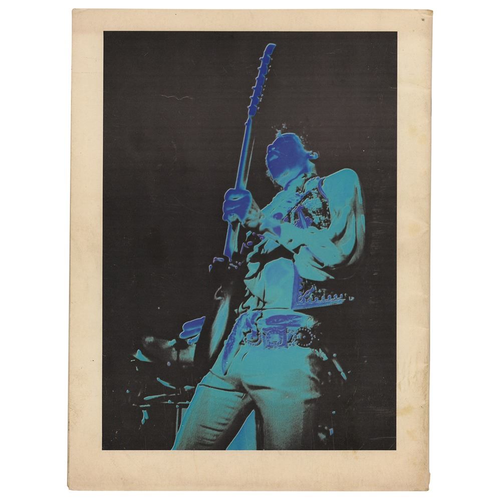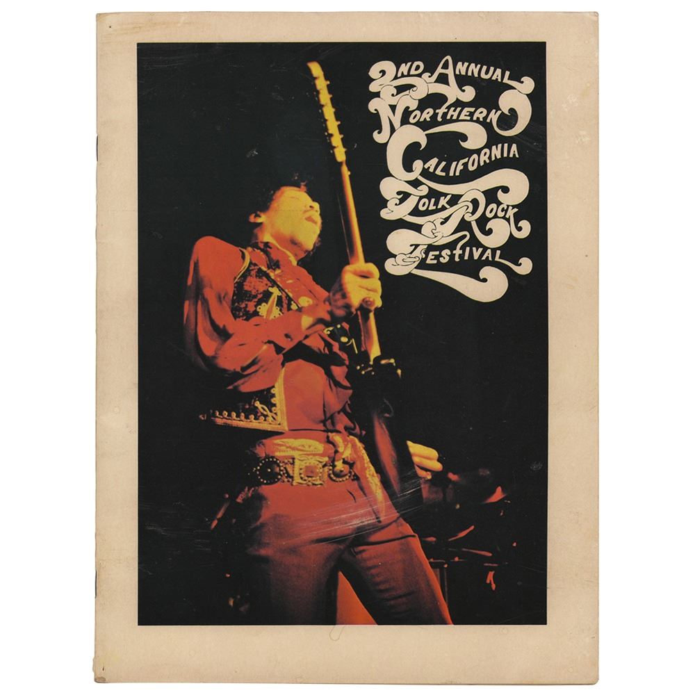 Extremely rare original program for the 2nd Annual Northern California Folk-Rock Festival held at the Santa Clara County Fairgrounds in San Jose, California, on May 23-25, 1969, 8.5 x 11.5, 20 pages, which features an opening letter from KROQ-FM program director Rick Carroll, and terrific images of the scheduled performers: the Jimi Hendrix Experience, Jefferson Airplane, The Chambers Brothers, Eric Burdon, Canned Heat, Steve Miller, Chuck Berry, and more. In fine condition, with light scuffs, stains, and creases to covers, with a pin hole to upper left corner passing through the entire program.