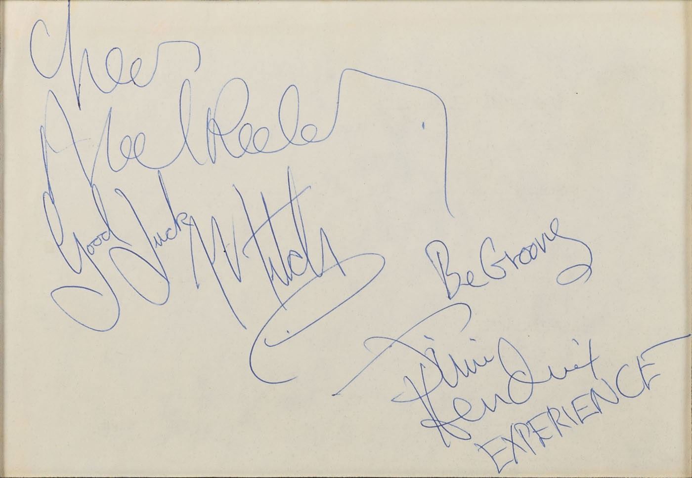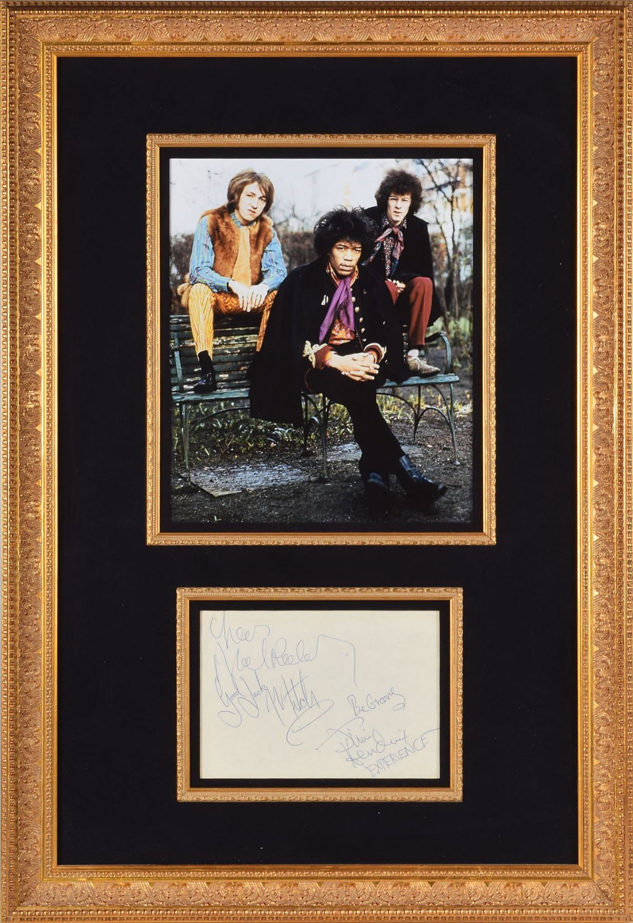 Huge vintage ballpoint signatures, "Be Groovy, Jimi Hendrix, Experience," "Cheers, Noel Redding," and "Good Luck, Mitch,” on the reverse of an off-white 7.75 x 5.5 Swedish radio playlist page. Beautifully double-suede-matted and framed with a color portrait of the group to an overall size of 20 x 29.5. In fine to very fine condition. An absolutely magnificent signature set—they don't get any better than this!