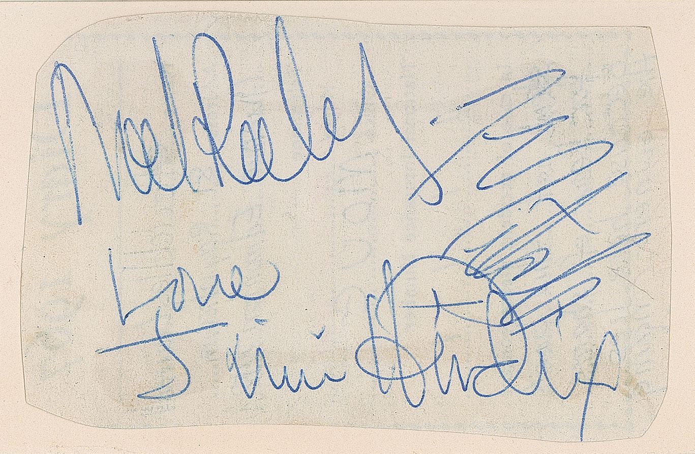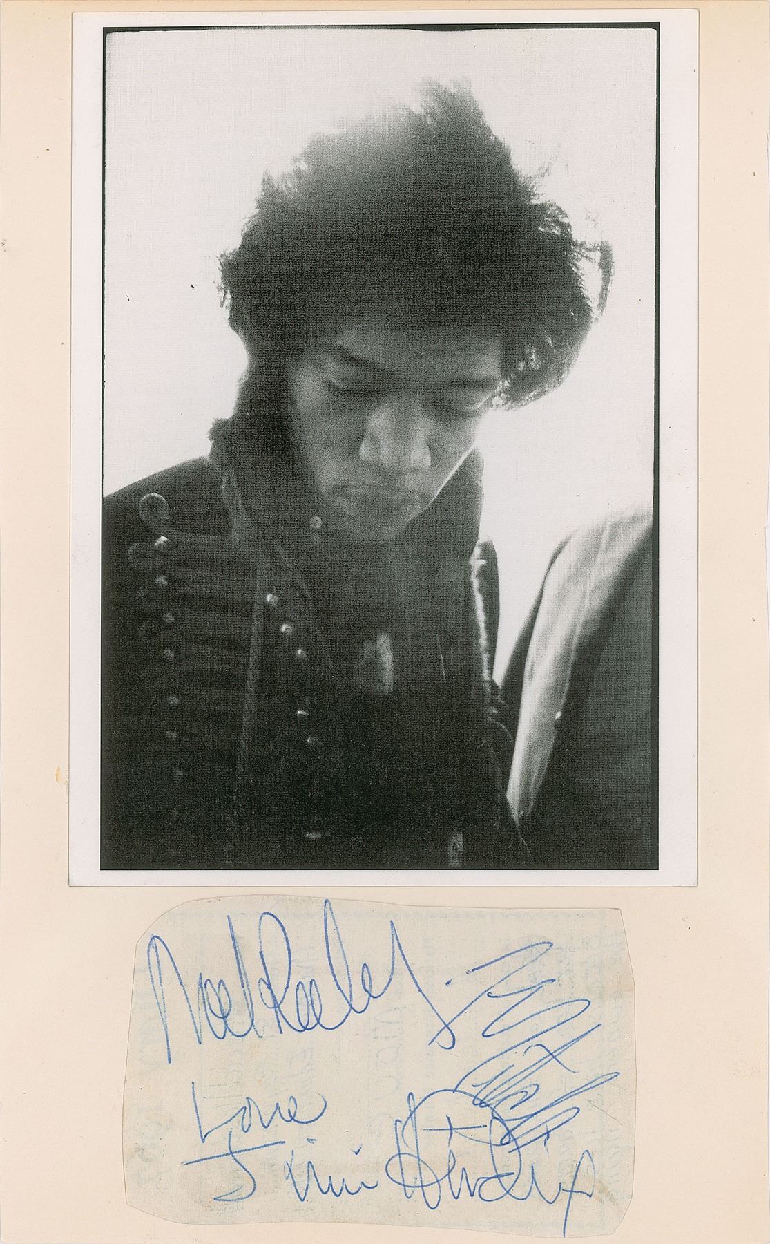 Vintage circa 1967 ballpoint signatures, "Love, Jimi Hendrix," "Noel Redding," and "Mitch,” on the reverse of an off-white 3.5 x 2.25 slip cut from the front of a 1967 pocket diary. Mounted to a 5 x 8.5 sheet which bears an affixed postcard depicting Hendrix in Paris in 1967. In fine condition, with light show-through from mounting on the reverse. Accompanied by a full letter of authenticity from PSA/DNA and a modern print of a photo taken of the bands on the tour. The consignor notes that these signatures were obtained on November 14, 1967, at the Royal Albert Hall, where the Jimi Hendrix Experience and The Move performed. The tour also featured Pink Floyd, still with their legendary founder Syd Barrett in the band (though in a very fragile state of mind) and also Amen Corner, The Nice (Keith Emerson), Eire Apparent, and The Outer Limits. This tour would be the Jimi Hendrix Experience’s second British tour and first as a headliner.