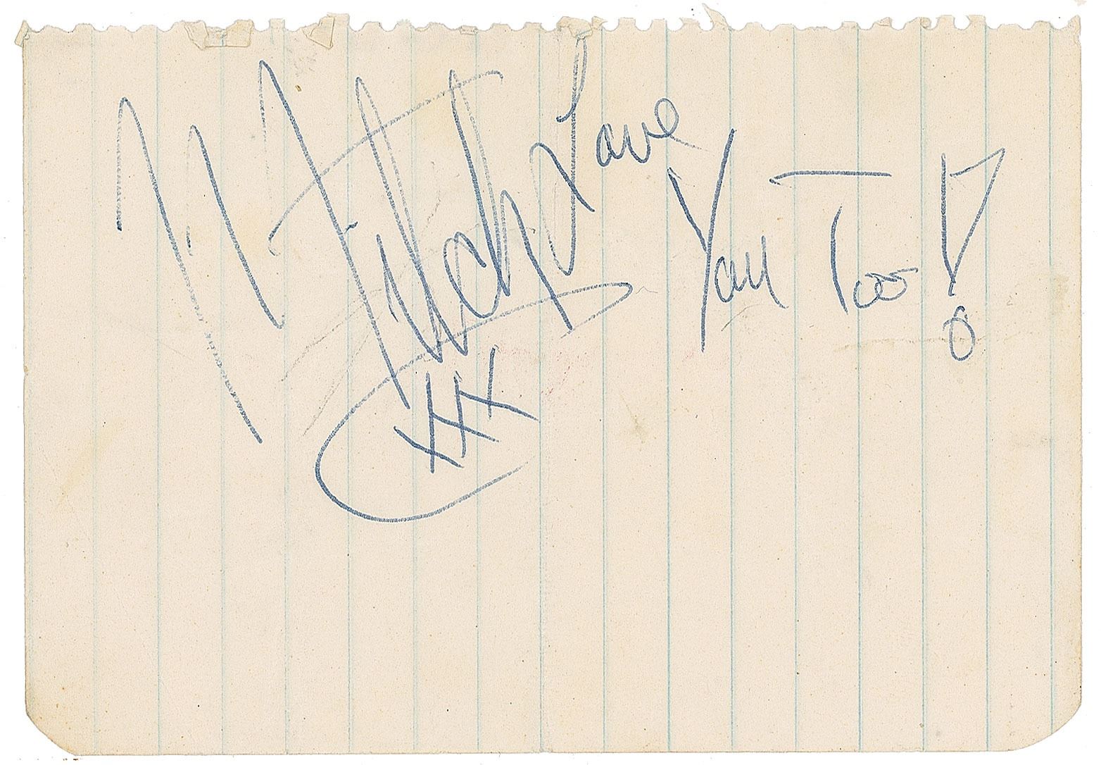 Coveted set of three vintage ballpoint signatures, "Jimi Hendrix," "Noel Redding," and "Mitch, xxx, Love You Too!," on individual lined slips. In very good to fine condition, with light overall creasing to all three slips.