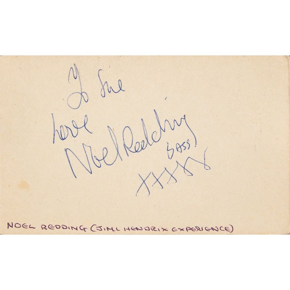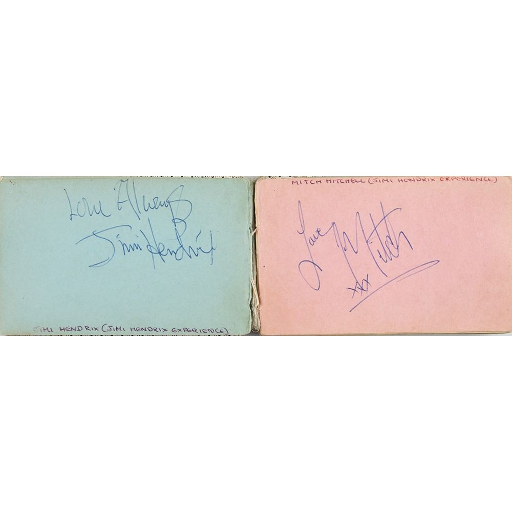 Vintage ballpoint signatures, "Love Always, Jimi Hendrix," "Love, Mitch, xxx," and "To Sue, Love, Noel Redding, bass, xxxxx,” on separate multi-colored 5 x 3 pages in their original hardcover autograph album. Among the other signers in the book are Del Shannon, Nicky James, Johnny Wells, and other lesser notables and unknowns. The original owner's name and address, in the South Woodford area of east London, are annotated inside the front cover. In fine condition, with the cover and pages detached.