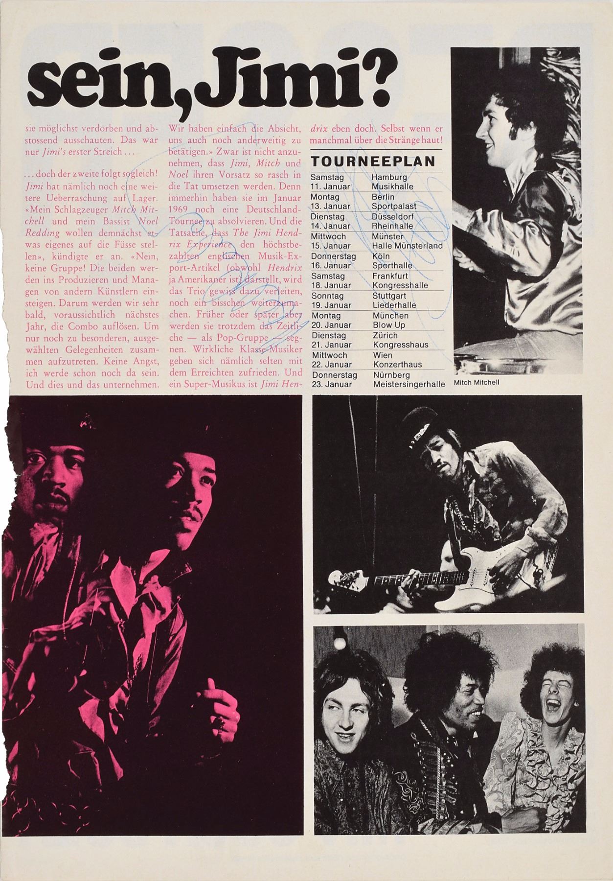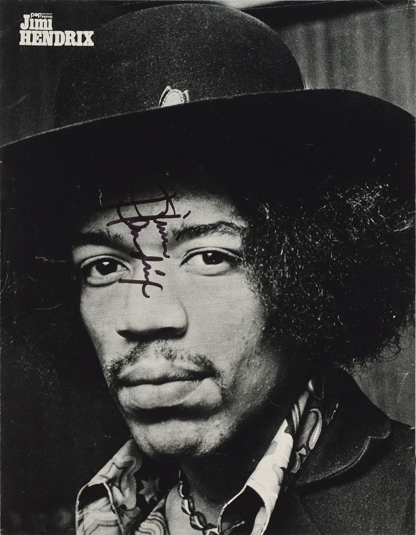 Sought-after pairing of circa early 1969 German Pop Foto magazine photos: a black-and-white 8.5 x 11 image of Hendrix in a serene close-up pose, vertically signed in black felt tip, "Jimi Hendrix"; and a color 8.25 x 11.25 article on the Jimi Hendrix Experience featuring four images of the band, signed in blue ballpoint, "Noel Redding" and "Mitch." Reverse of the Hendrix-signed photo opens to reveal a centerfold of the band Ten Years After, which is signed in blue ballpoint, "Chick Churchill," "Ric Lee," "Leo Lyons," and "Alvin Lee." In overall very good to fine condition, with general light handling wear and surface impressions from signatures on reverse of Hendrix. Accompanied by a color 3.25 x 3.5 candid photo of Hendrix taken at the time of signing. Consignor notes that the Experience autographs were obtained outside Berlin's Kempinski Hotel on January 23, 1969. At the time of the signing, Hendrix and the Experience had been in Europe for nearly three weeks, playing several Scandinavian and West Germany dates in support of the band's third and final album, Electric Ladyland. A full set of Experience signatures remains highly desirable, with the visual appeal of these two magazine pages absolutely ideal for display.