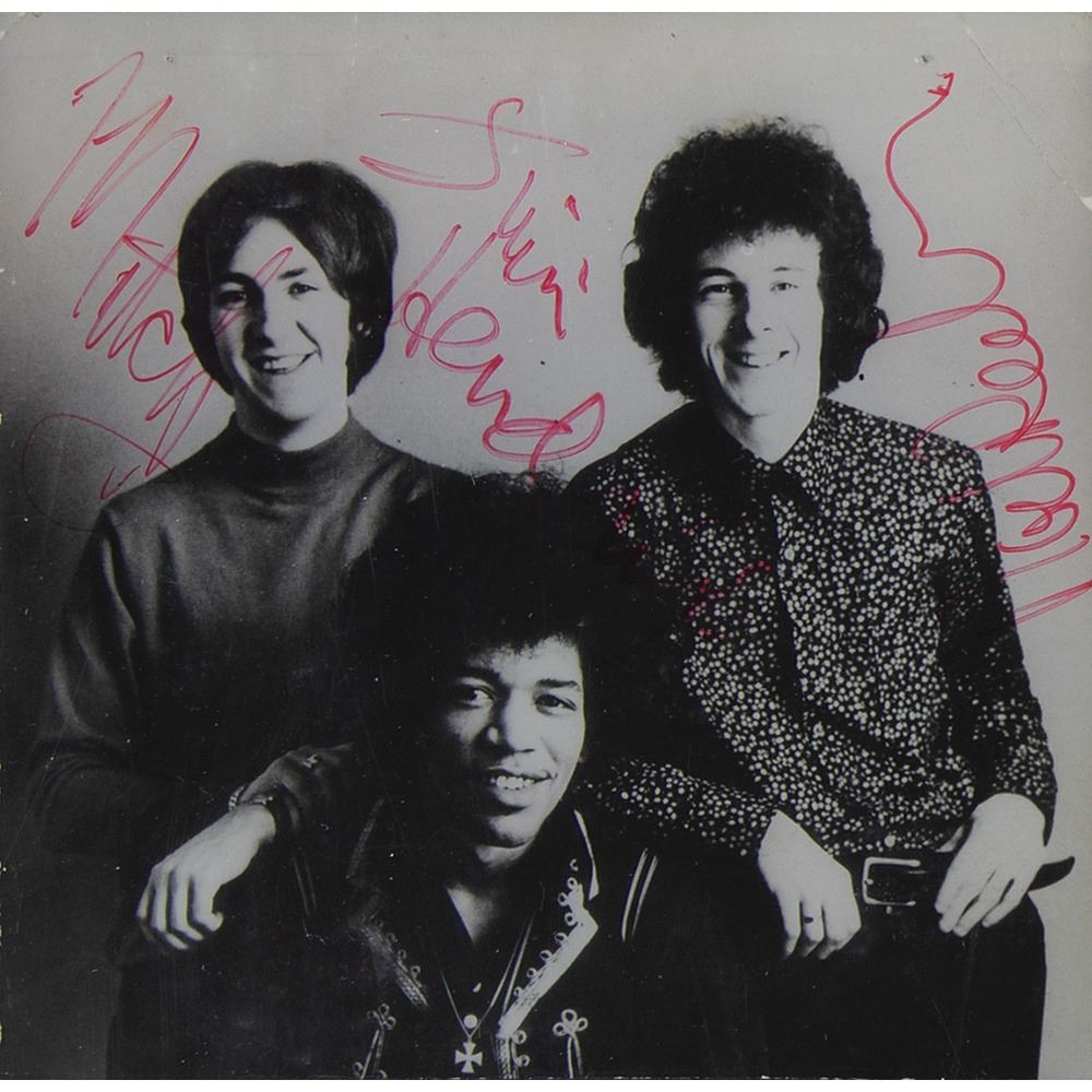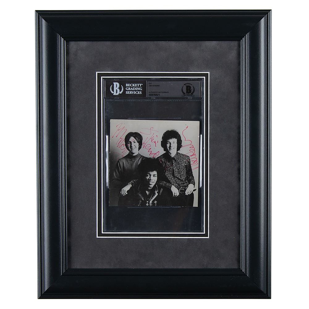 Outstanding vintage glossy 5 x 5 Polydor publicity photo of the Jimi Hendrix Experience, nicely signed in red felt tip by Jimi Hendrix, Mitch Mitchell, and Noel Redding. Encapsulated by Beckett Authentication Services, double-suede-matted, and framed to an overall size of 13.5 x 16.5. In very good to fine condition, with moderate overall creasing, a trimmed bottom edge, and pin holes to the top corners. A previous auction listing indicated that the signatures were obtained following a Jimi Hendrix Experience concert at Berlin's Deutschlandhalle on September 4, 1970, only two weeks before Hendrix succumbed to a drug overdose.