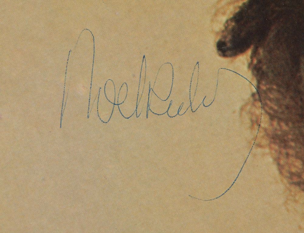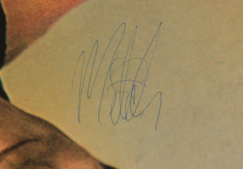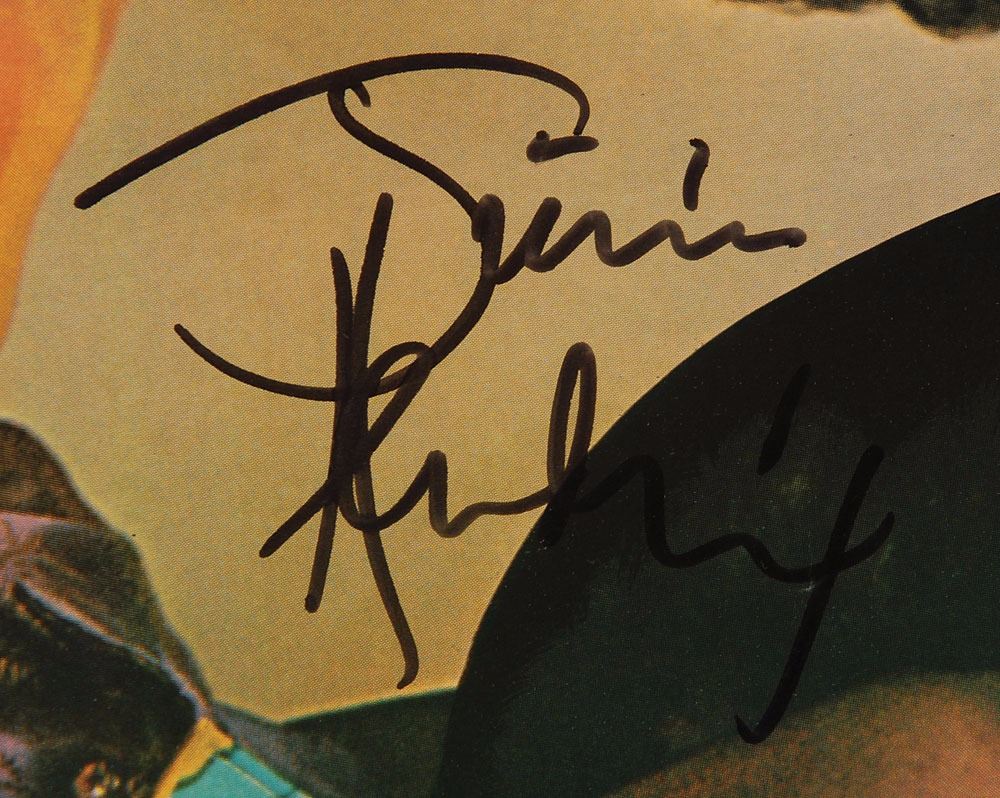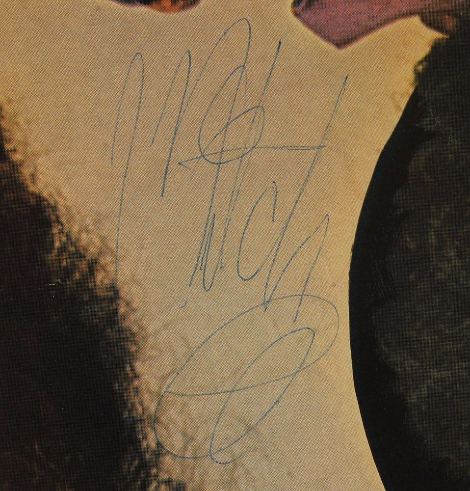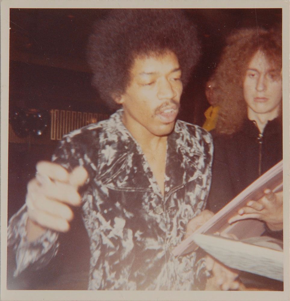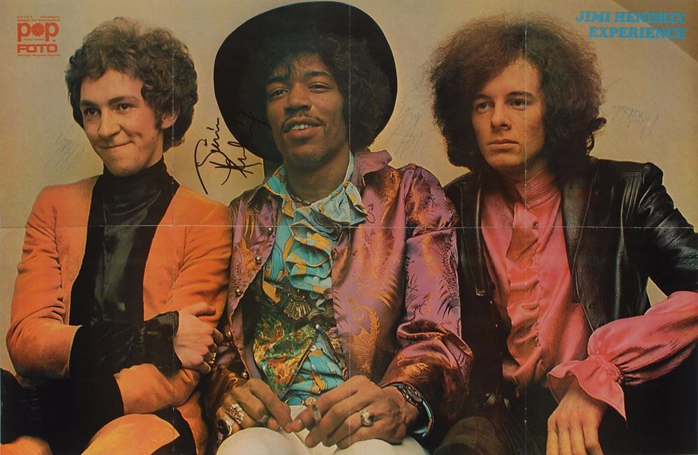 Amazing color 32.25 x 21.5 Pop Foto poster of the Jimi Hendrix Experience, signed in black felt tip by Jimi Hendrix, and in ballpoint by Noel Redding and Mitch Mitchell, who has signed his first name twice. In fine, folded condition, with scattered creases and tiny separations along small portions on folds. Accompanied by a color 3.25 x 3.25 candid photo of Hendrix taken at the time of signing, as well as a Playboy signed by Uschi Obermaier, whom Hendrix shared a brief affair, as well as two photos of Obermaier with filmmaker and then boyfriend Rainer Langhans. Consignor notes that the Experience autographs were obtained outside Berlin's Kempinski Hotel on January 23, 1969.