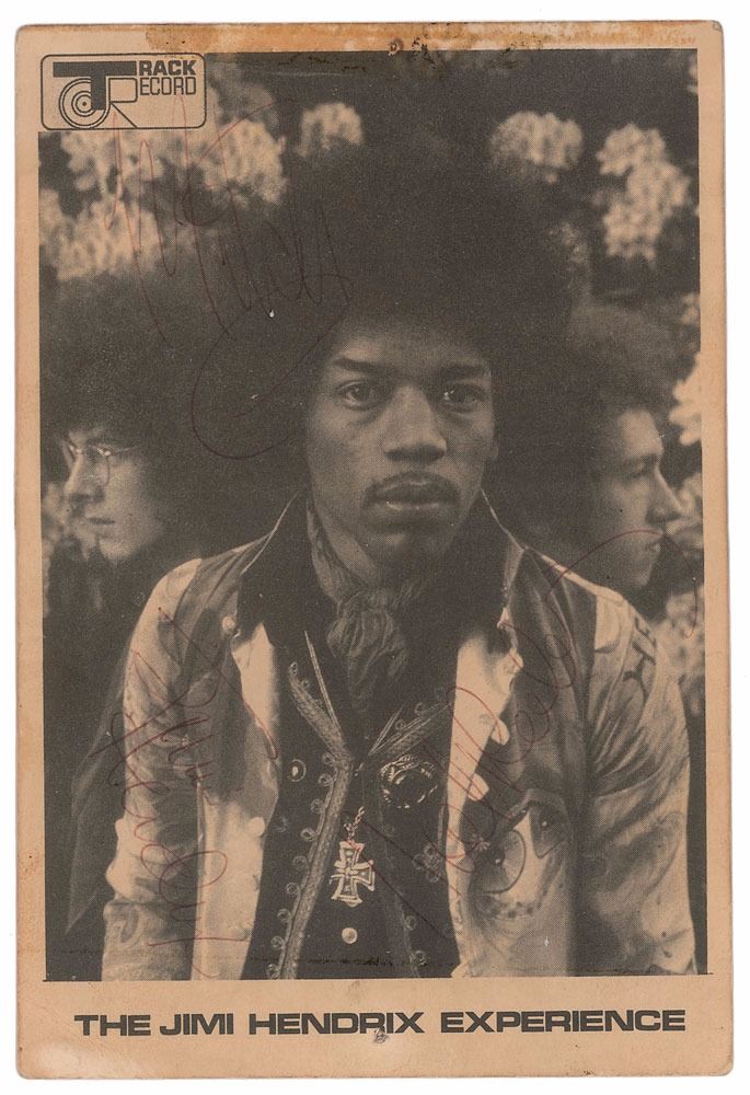 Vintage Track Records promo card for The Jimi Hendrix Experience from October 1967, 4 x 6, signed in red ballpoint, "Jimi Hendrix," "Noel Redding," and "Mitch." The reverse sides lists various Track Records releases: "Hey Joe / Stone Free," "Purple Haze / 51st Anniversary," "The Wind Cries Mary / Highway Chile," "The Burning of the Midnight Lamp / The Stars That Play with Laughing Sam's Dice," and "Are You Experienced (LP)." In very good to fine condition, with old adhesive residue and a tack hole to the top edge, scattered light creasing, and moderate contrast to all three signatures. Accompanied by a full letter of authenticity from PSA/DNA. The consignor notes that the promo card and signatures were obtained at Queens College's Whitla Hall in Belfast, Ireland, on November 27, 1967, at a concert billed as ‘Festival of Arts.’ Also on the bill were Syd Barrett–era Pink Floyd, The Move, The Nice, Amen Corner, The Outer Limits. and Eire Apparent. The 27th happened to be Jimi’s 25th birthday, and he was given a birthday cake by the festival organizers. 1967 proved to be the most significant year in the brief life span of The Jimi Hendrix Experience—their full-length debut, Are You Experienced, was released in the UK and USA in May and August; Hendrix famously lit his Fender Stratocaster on fire at the June 1967 Monterey Pop Festival; and their second studio masterpiece, Axis: Bold as Love, was released in the UK in early December. An immensely appealing promo card signed by the band during their most productive period.
