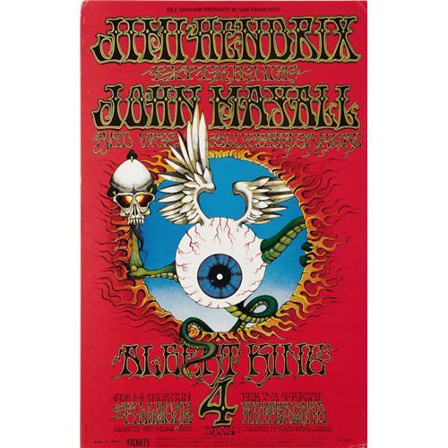 <B>Jimi Hendrix Experience Winterland/Fillmore Concert Poster BG-105 (Bill Graham Presents, 1968)</B></I> A classic Rick Griffin "Flying Eyeball" bursts out of a flaming ring on this iconic poster for the great Jimi Hendrix. Opening for Jimi was British Bluesmaster John Mayall and American Blues guitar whiz Albert King. What a show this must have been! This is a second printing. Some minor corner damage knocks this down to Very Good+ status, but trust us -- it's a killer poster you'll be proud to own!