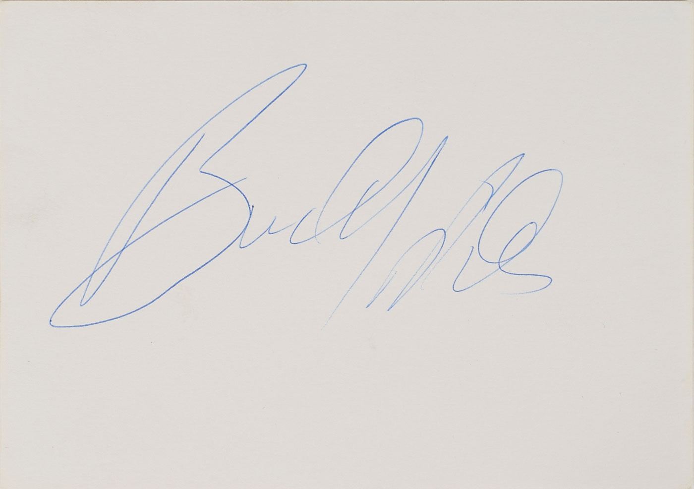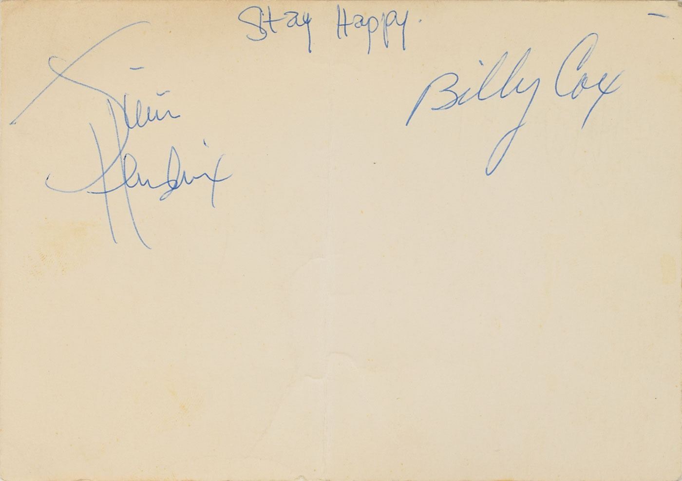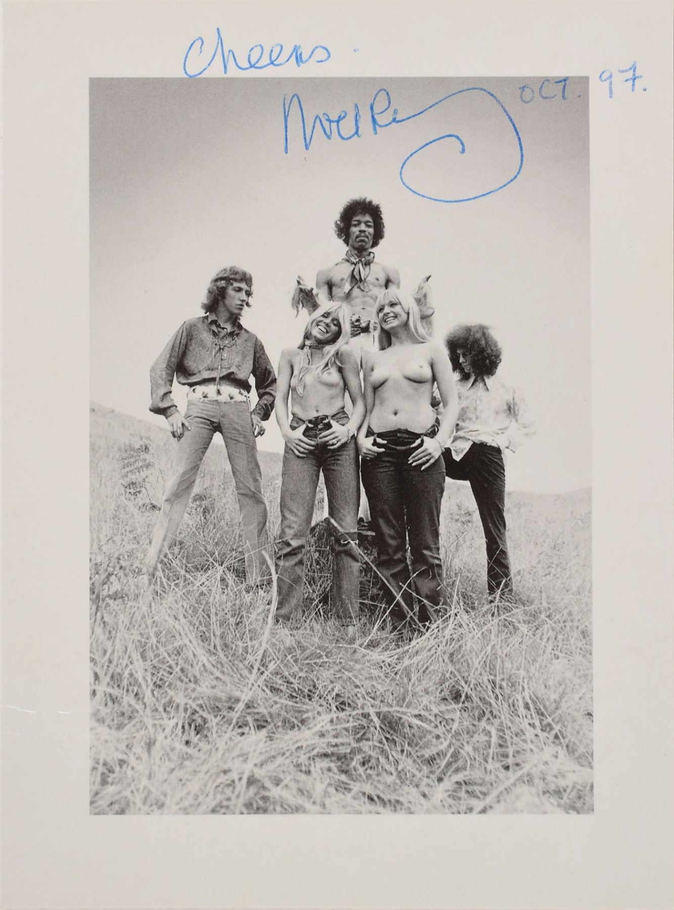Vintage ballpoint signatures, "Stay Happy, Jimi Hendrix" and "Billy Cox" on an off-white 5.75 x 4 sheet, with a ballpoint signature on the opposite side, "Mitch Mitchell." Also includes a white 6 x 4 card signed in blue ballpoint by the Band of Gypsys drummer, "Buddy Miles," and a glossy 4.25 x 5.75 postcard photo of the Experience posing with two topless women on a Hawaiian hillside, signed in blue ballpoint, "Cheers, Noel Redding, Oct. 97." Reverse of postcard bears collector's ink notations indicating that the signature was obtained at a Berlin music club in October 1997. In very good to fine condition, with scattered creasing and a central vertical fold to card, and creasing to lower half of the photo. Consignor notes that the Hendrix, Cox, and Mitchell signatures were obtained on September 4, 1970, at Super Concert '70, a one-day music festival held at Berlin's Deutschlandhalle. The massive event was headlined by Hendrix, and included other artists like Canned Heat, Procol Harum, and Ten Years After. The concert was the second-to-last of Hendrix's career; his final stage appearance was at the Open Air Love & Peace Festival in Fehmarn, Germany, on September 6, 1970, just twelve days before his untimely death. A coveted assemblage of the entire Experience and Band of Gypsys lineups.