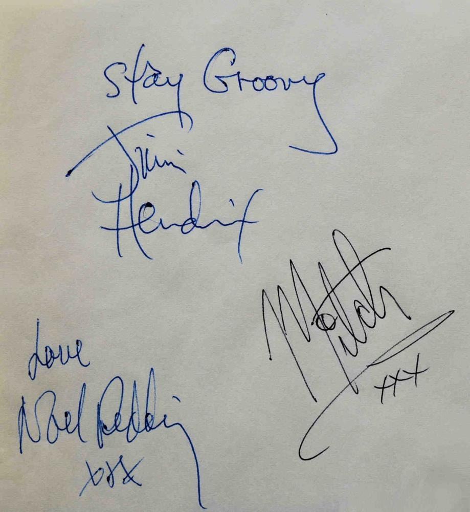 Jimi Hendrix Experience 5 in. by 5 1/4 in. slip. Signed: Stay Groovy Jimi Hendrix, Love Noel Redding xxx and Mitch xxx