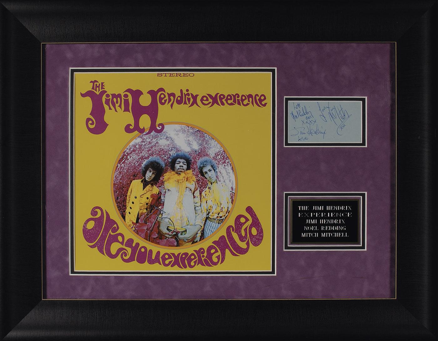 Vintage ballpoint signatures, “Jimi Hendrix Love,” “Love Noel Redding Bass xxxx,” and “Love you, Mitch xxx,” on a light blue 4.5 x 2.5 album page. Double suede matted and framed with a Jimi Hendrix Experience album cover and a name plaque to an overall size of 26.5 x 20.5. In fine condition. Accompanied by a letter of provenance from the signatures’ original owner, who gave her autograph album to a friend of a friend of the manager of the Gaumont Cinema, who acquired the signatures after an April 1967 concert. Also accompanied by a certificate of authenticity from Tracks. An extremely handsome example of this legendary rock and roll power trio. Oversized.
