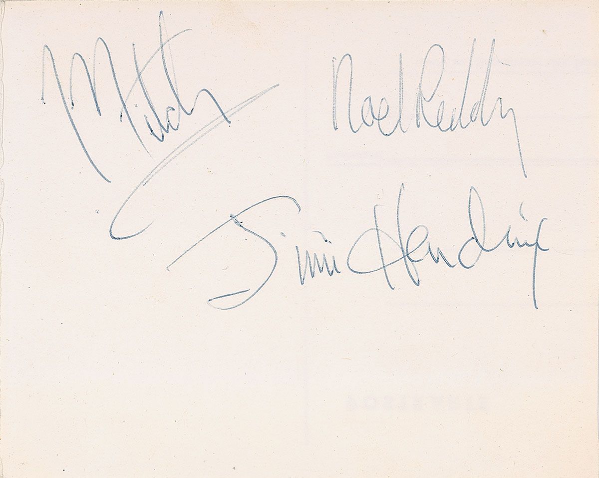 Fantastic vintage ballpoint signatures, “Jimi Hendrix,” “Mitch,” and “Noel Redding,” on an off-white postcard, trimmed to a size of 5 x 4. In very fine condition. Accompanied by a full letter of authenticity from Roger Epperson/REAL, as well as a letter of authenticity from Jeffrey Gold at Recordmecca. An extremely handsome example of this legendary rock and roll power trio.