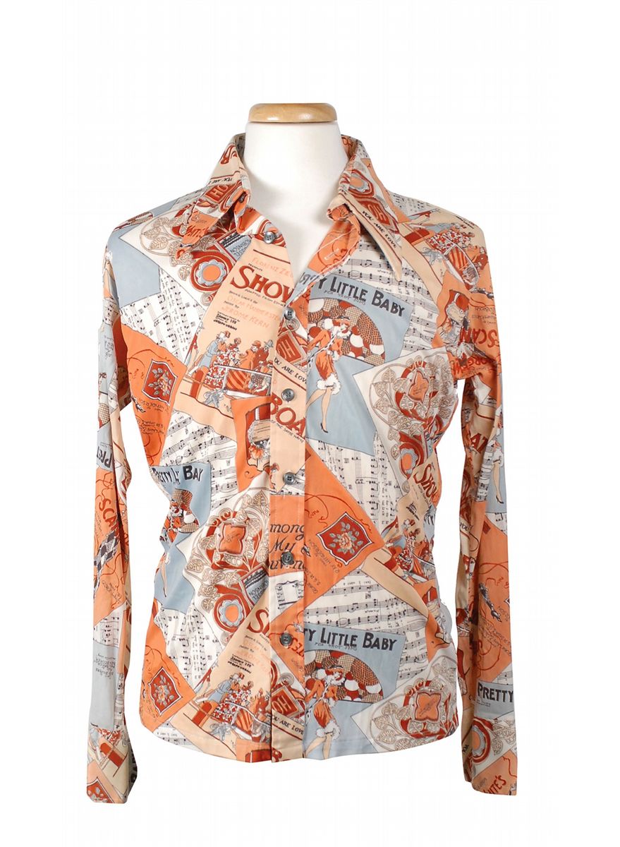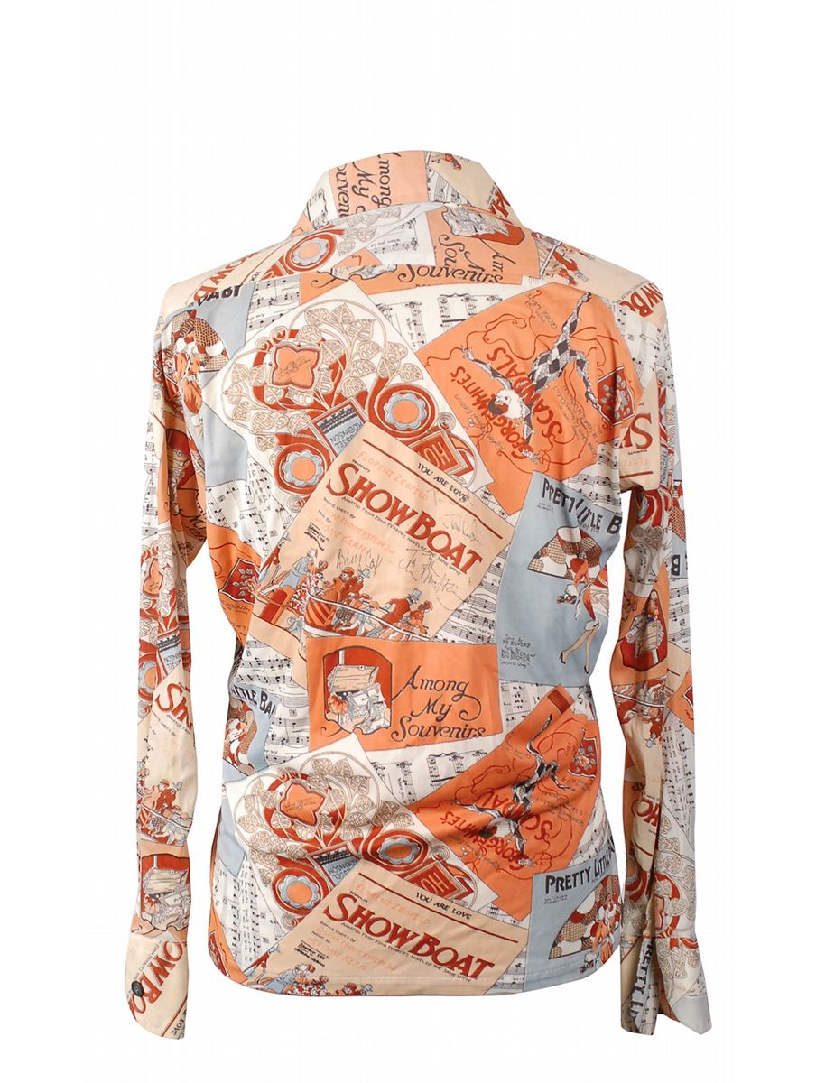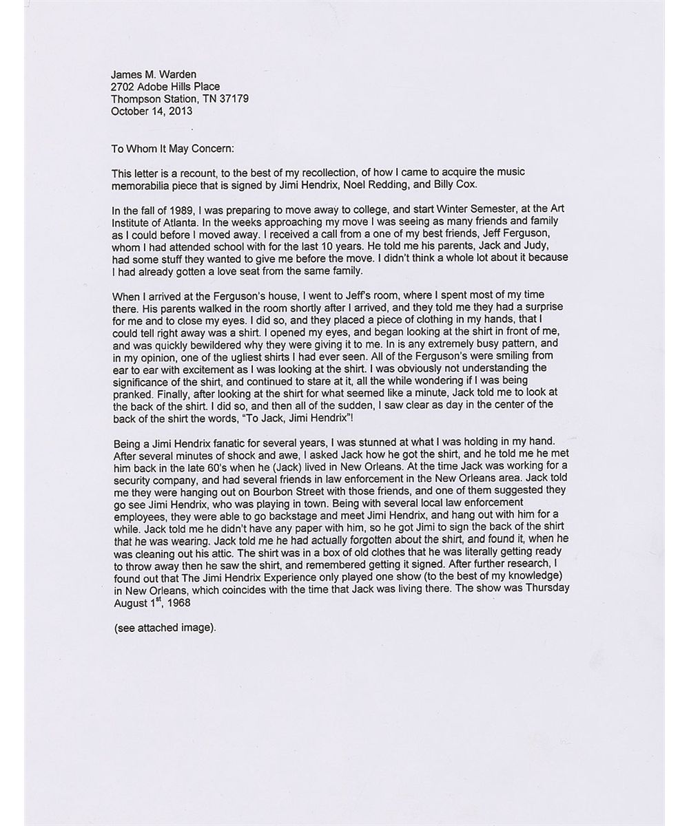 Unusual musically-themed long-sleeve dress shirt with patterns of sheet music pages and covers, including ‘Showboat’ and ‘Pretty Little Baby,’ with a Monzini Knits tag sewn into the collar. Signed and inscribed on the back in black ink, “To Jack: Jimi Hendrix.” Shirt is also signed and inscribed (at a later date), “To Jack: Noel Redding,” and “Billy Cox.” Accompanied by a letter of provenance from a previous owner, who was gifted the shirt by a friend. Letter reads, in part: “I received a call from one of my best friends, Jeff Ferguson…He told me his parents, Jack and Judy, had some stuff they wanted to give me…They placed a piece of clothing in my hands, that I could tell right away was a shirt…I was obviously not understanding the significance of the shirt…Jack told me to look at the back of the shirt, I did so, then all of a sudden, I saw clear as day in the center of the shirt the words, ‘To Jack, Jimi Hendrix.’…Jack…told me he met him back in the late 60s when he (Jack) lived in New Orleans. At the time Jack was working for a security company, and had several friends in law enforcement in the New Orleans area…They were able to go backstage and meet Jimi Hendrix, and hang out with him for a while. Jack told me he didn’t have any paper with him, so he got Jimi to sign the back of the shirt he was wearing.” Also accompanied by a second letter stating that Redding’s signature was obtained while he was touring the US in the 1990s, and Cox’s was acquired on June 18, 2012, in Nashville, Tennessee, where he also verified Hendrix’s autograph. In fine condition, with a small hole above Redding’s signature. Hendrix played just one show in New Orleans, stopping there on August 1, 1968, during his US tour.