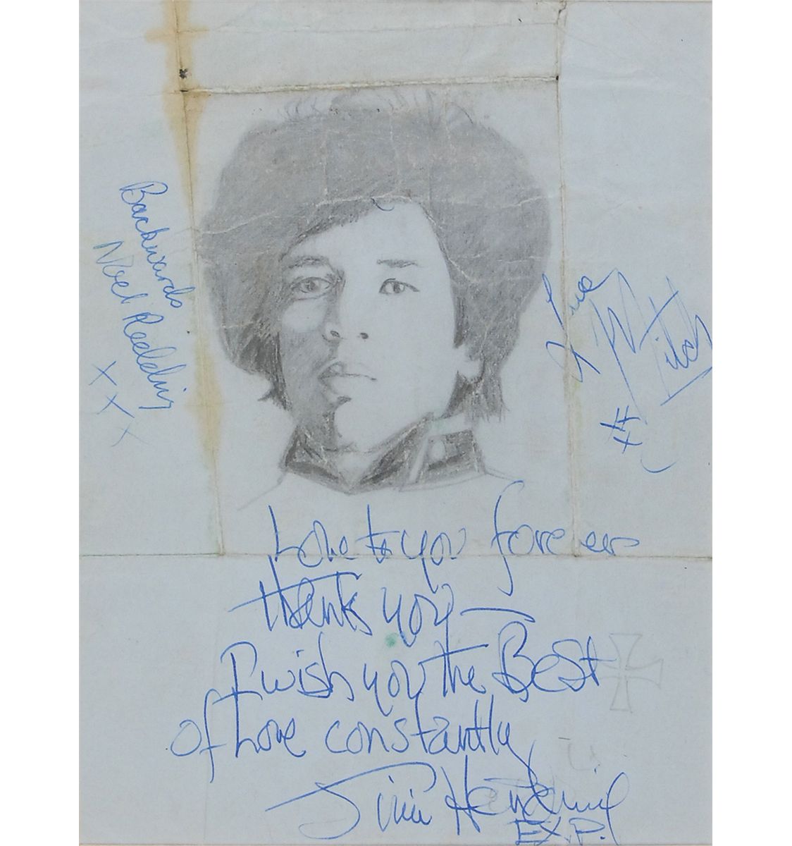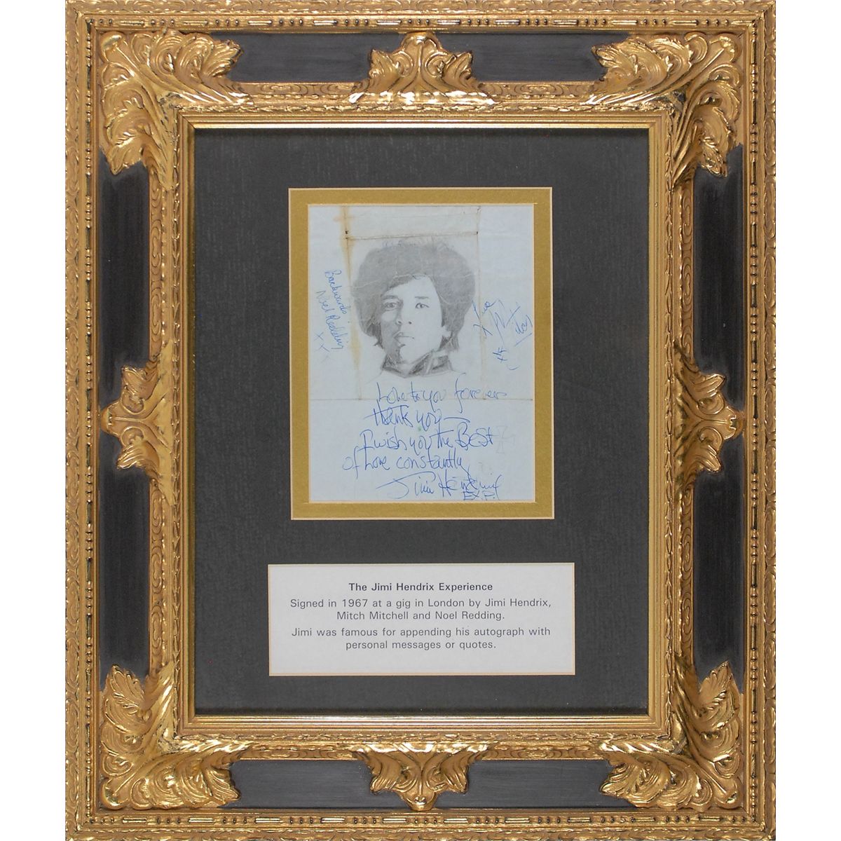 Vintage ink signatures, “Love to you forever, thank you—I wish you the best of love constantly, Jimi Hendrix EXP,” “Backwards, Noel Redding xxx,” and “Love, Mitch xxx,” on a light blue 5 x 6.5 sheet, with a pencil sketch of Hendrix in the center of the sheet, almost certainly done by the fan before meeting the band for their signatures. Double-matted and framed with a printed descriptive caption which states, “Signed in 1967 at a gig in London,” to an overall size of 16.5 x 19.5. In very good to fine condition, with intersecting folds, one through a single letter of Hendrix’s signature, toning along upper portions of folds, and some scattered light creases. Hendrix played London several times with such luminaries in the crowd as John Lennon, Ringo Starr, Pete Townshend, John Entwistle, and Eric Clapton taking in the shows. A one-of-a-kind set of signatures from the legendary power trio, with a very lengthy sentiment from Hendrix, acquired during their rise to prominence.