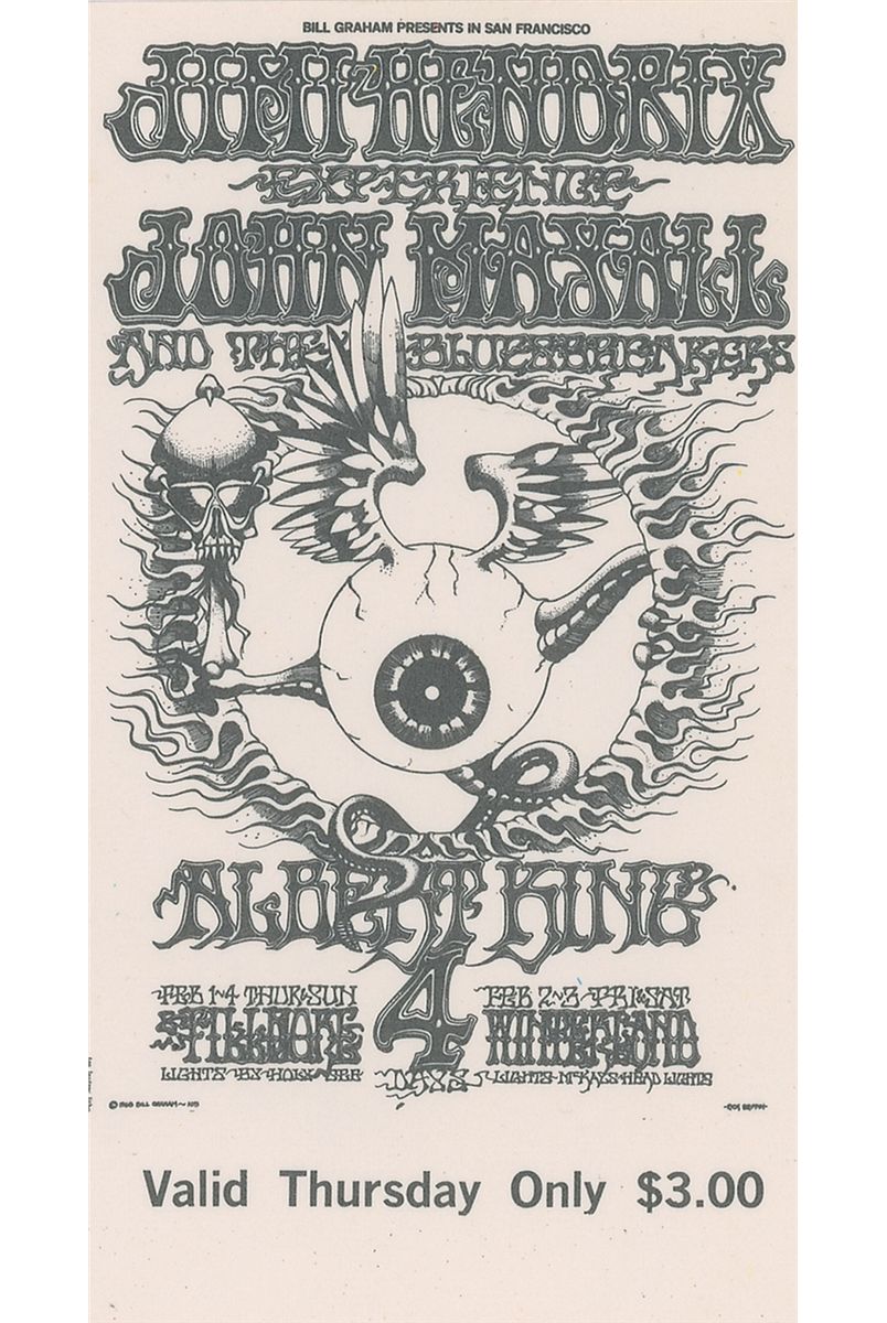 Unused concert ticket for admission to the Jimi Hendrix Experience show at the Fillmore Winterland, on February 1, 1968, 2.5 x 4.5, featuring the classic ‘flying eyeball’ design by Rick Griffin. Supporting acts at the concert were John Mayall and Albert King. In fine condition.
