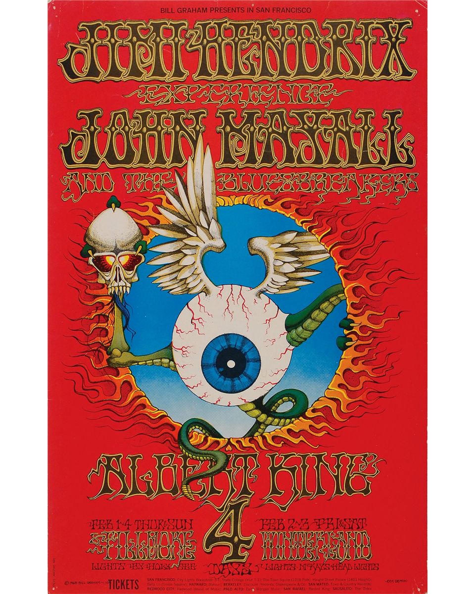 Original 13.75 x 21.75 second printing color poster for the Jimi Hendrix Experience and John Mayall shows presented by Bill Graham at the Fillmore and Winterland, BG-105, in early February of 1968. Poster features great artwork by Rick Griffin with his ‘flying eyeball’ at the center. A single tack hole to each corner tip, some scattered light creases, and areas of slight surface loss to reverse, otherwise fine condition.