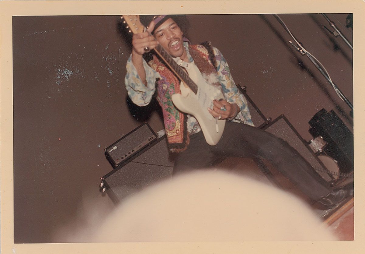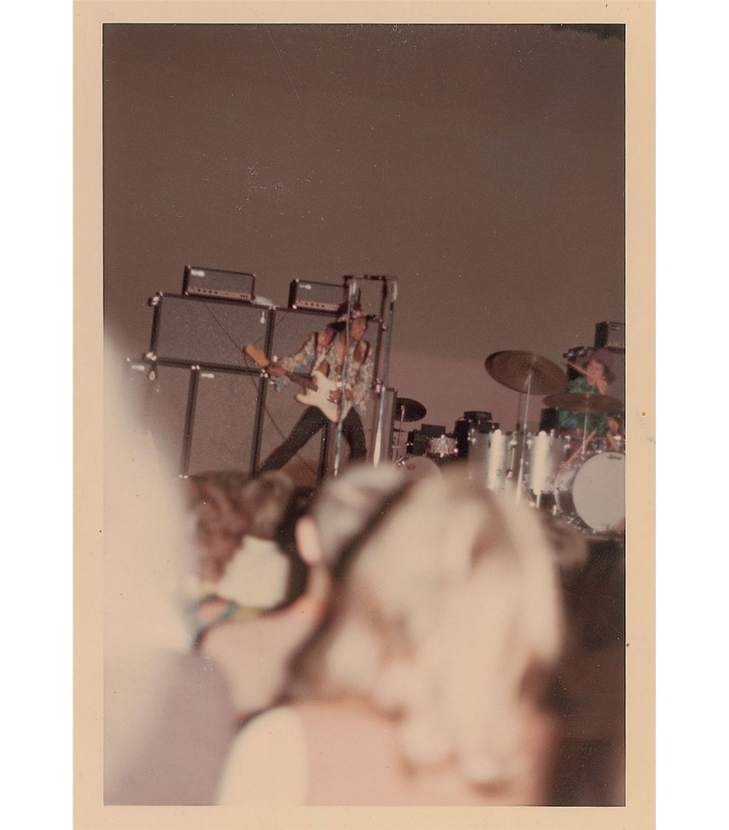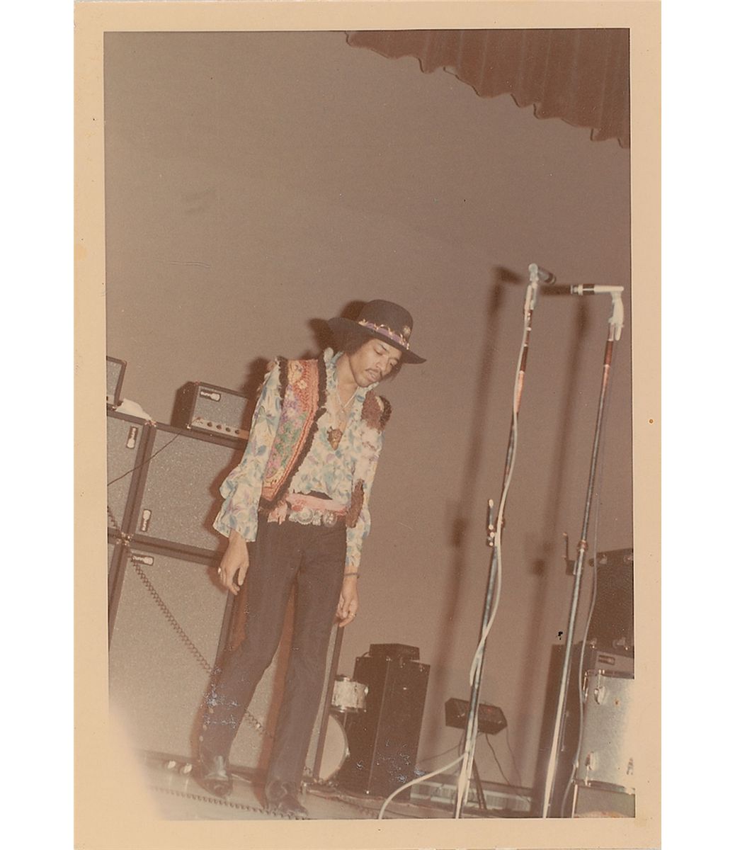 Four original color candid 3.5 x 5.5 photos of Hendrix and the Experience on stage at an unidentified venue, including three of him playing guitar. In fine condition.