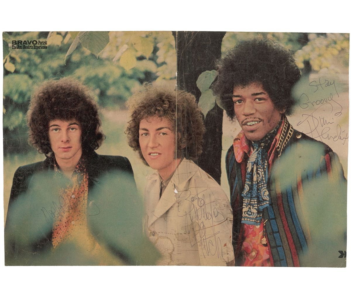 Color vintage 16 x 11 two-page magazine photo spread from the German music magazine Bravo, signed in black felt tip, “Stay Groovy, Jimi Hendrix,” “Best wishes, Mitch,” and “Noel Redding.” In fine condition, with slight paper loss along central vertical fold from staples, and some scattered creasing and wrinkles. Signatures were obtained at the Ambassador Hotel in Hamburg, Germany, on January 12, 1969, one day after the band played a concert at the Musikhalle in Hamburg. Hendrix actually performed two shows that day at the German venue as part of his 1969 European tour, performing 16 songs in total, including ‘Purple Haze,’ ‘Voodoo Child (Slight Return),’ and a cover of Cream’s ‘Sunshine of Your Love.’ Oversized portraits of this legendary power trio are seldom encountered.