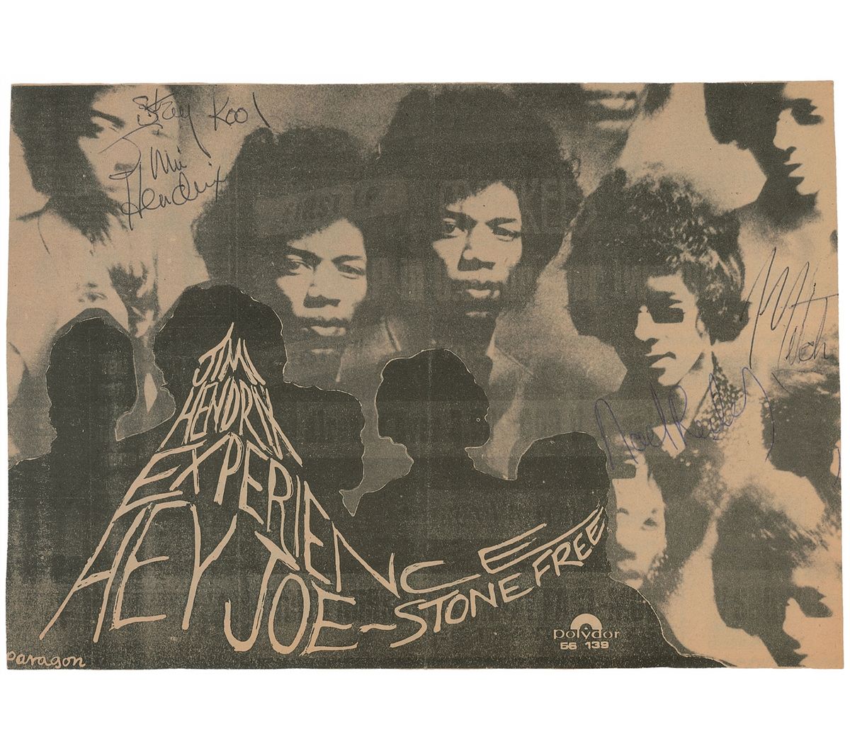 Rare vintage 9.75 x 7 UK newspaper photo advertising the Polydor release of their debut single ‘Hey Joe/Stone Free,’ signed in blue and black ballpoint, “Stay Kool, Jimi Hendrix,” “Mitch,” and “Noel Redding.” In fine condition. Accompanied by a certificate of authenticity from Tracks. The single was released in the UK on December 16, 1966, peaking at number six on the charts.
