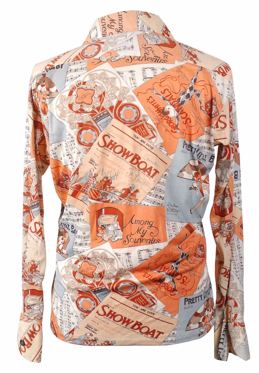 Unusual musically-themed long-sleeve dress shirt with patterns of sheet music pages and covers, including ‘Showboat’ and ‘Pretty Little Baby,’ with a Monzini Knits tag sewn into the collar. Signed and inscribed on the back in black ink, “To Jack: Jimi Hendrix.” Shirt is also signed and inscribed (at a later date), “To Jack: Noel Redding,” and “Billy Cox.” Accompanied by a letter of provenance from a previous owner, who was gifted the shirt by a friend. Letter reads, in part: “I received a call from one of my best friends, Jeff Ferguson…He told me his parents, Jack and Judy, had some stuff they wanted to give me…They placed a piece of clothing in my hands, that I could tell right away was a shirt…I was obviously not understanding the significance of the shirt…Jack told me to look at the back of the shirt, I did so, then all of a sudden, I saw clear as day in the center of the shirt the words, ‘To Jack, Jimi Hendrix.’…Jack…told me he met him back in the late 60s when he (Jack) lived in New Orleans. At the time Jack was working for a security company, and had several friends in law enforcement in the New Orleans area…They were able to go backstage and meet Jimi Hendrix, and hang out with him for a while. Jack told me he didn’t have any paper with him, so he got Jimi to sign the back of the shirt he was wearing.” Also accompanied by a second letter stating that Redding’s signature was obtained while he was touring the US in the 1990s, and Cox’s was acquired on June 18, 2012, in Nashville, Tennessee, where he also verified Hendrix’s autograph. In fine condition, with a small hole above Redding’s signature. Hendrix played just one show in New Orleans, stopping there on August 1, 1968, during his US tour.