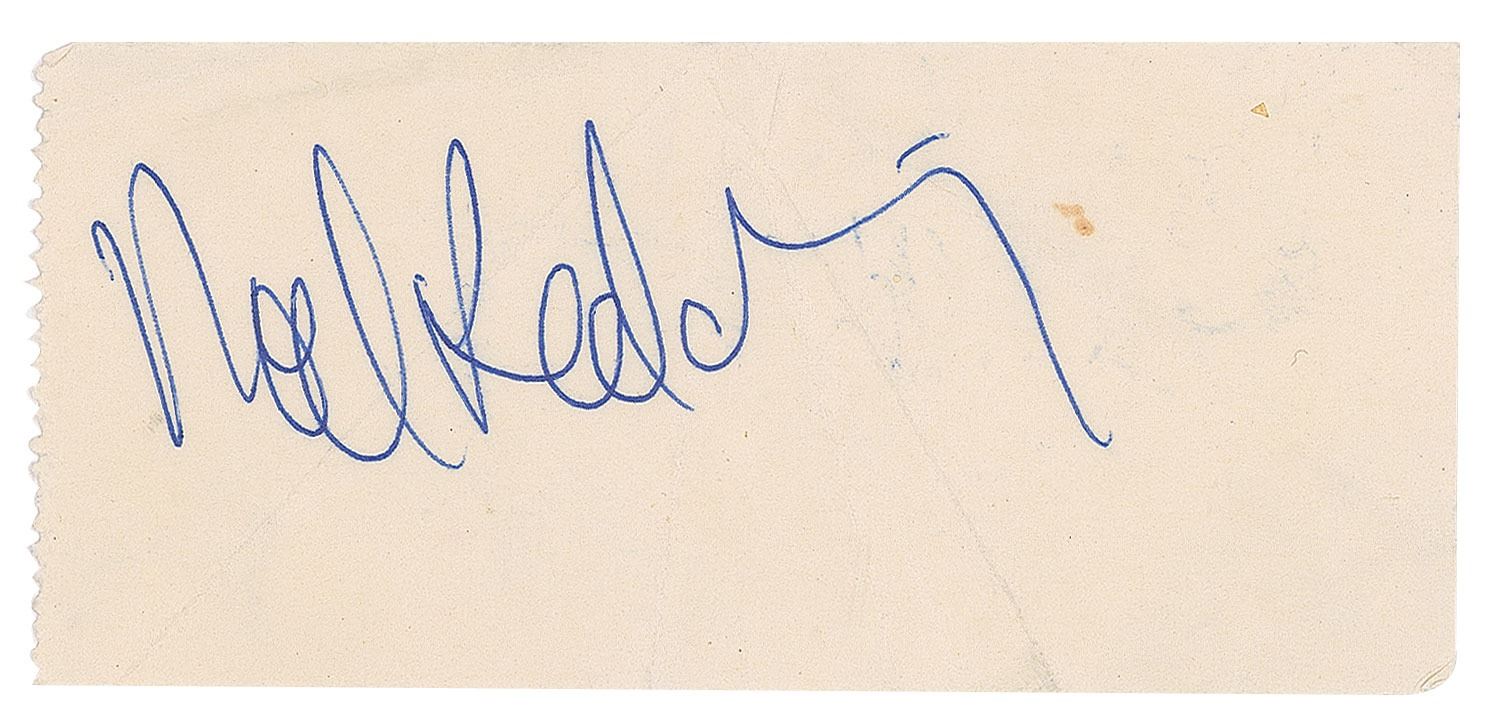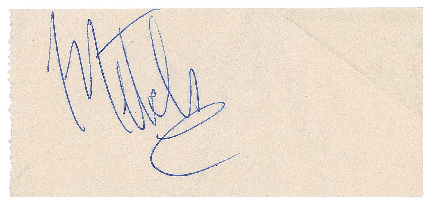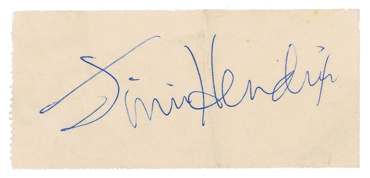 Sought-after set of three ballpoint signatures, "Jimi Hendrix," "Noel Redding," and "Mitch," on individual off-white 4.25 x 2 sheet. In overall very good condition, with several folds, and overall creasing. Accompanied by two images of the original recipient with the signatures, as well as a letter of provenance in Swedish, which affirms that the autographs were obtained at Torslanda Airport in 1967.