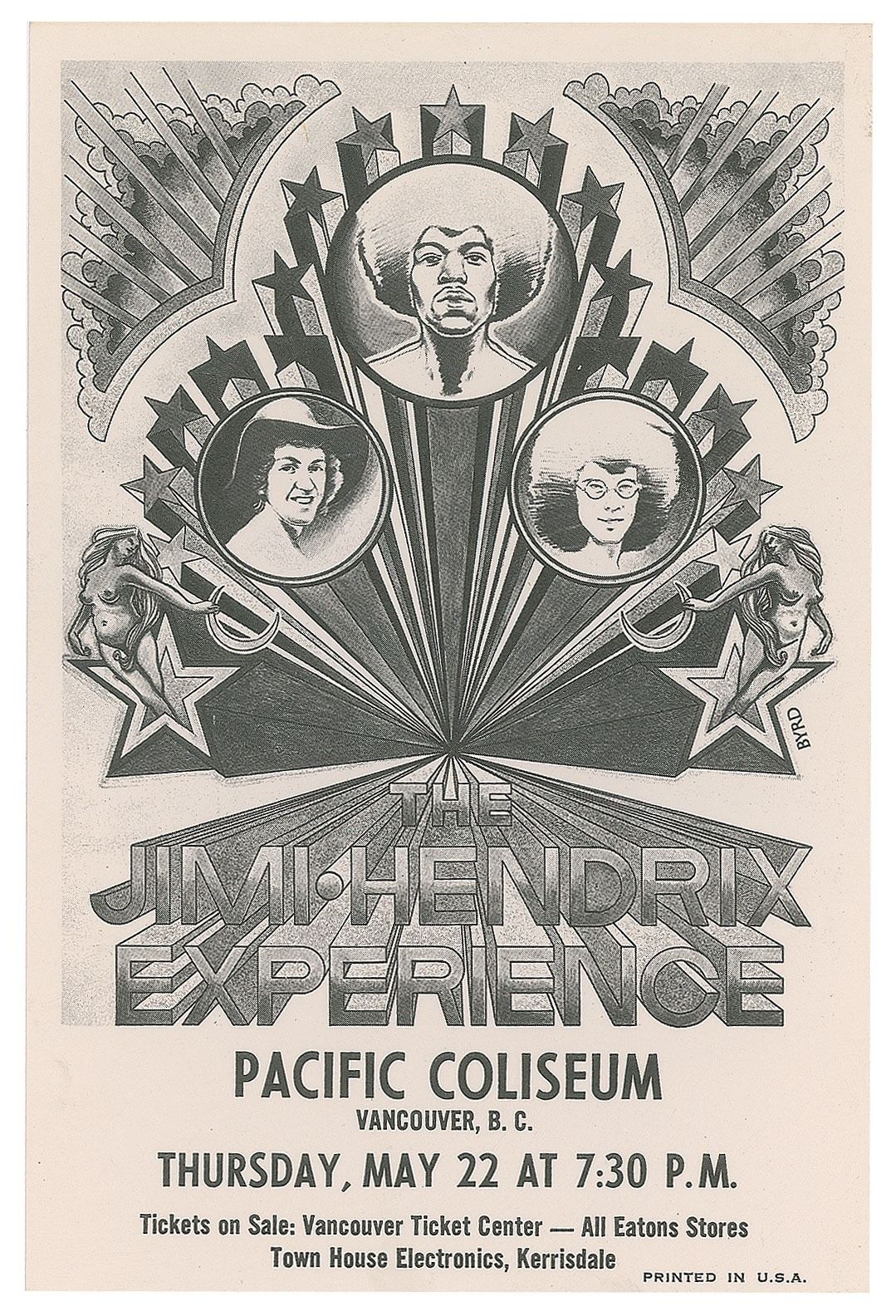 Original first printing handbill for a Jimi Hendrix Experience concert at the Pacific Coliseum in Vancouver, British Columbia, on May 22, 1969, measures 4.5 x 6.5, with artistic images and background by David Byrd and ticket information printed below. In fine condition.