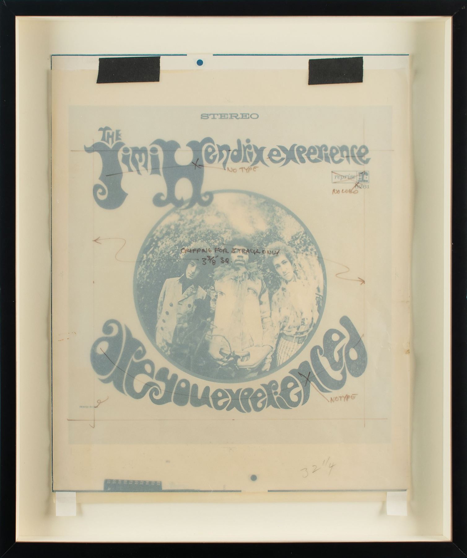 Rare original 8-track tape artwork design for Are You Experienced, the debut studio album from The Jimi Hendrix Experience, as commissioned by the Warner Bros. Records art department in 1967. The 'mechanical' depicts Karl Ferris’s fisheye image of Hendrix, Mitch Mitchell, and Noel Redding posing together with matching afro haircuts between the band and album name, 14 x 17, with affixed vellum overlay annotated with design instructions and measurements, such as: “No Type,” “No Logo,” and “Cropping for 8 Track Only.” Mounted and framed to an overall size of 18 x 21.5. In fine condition.