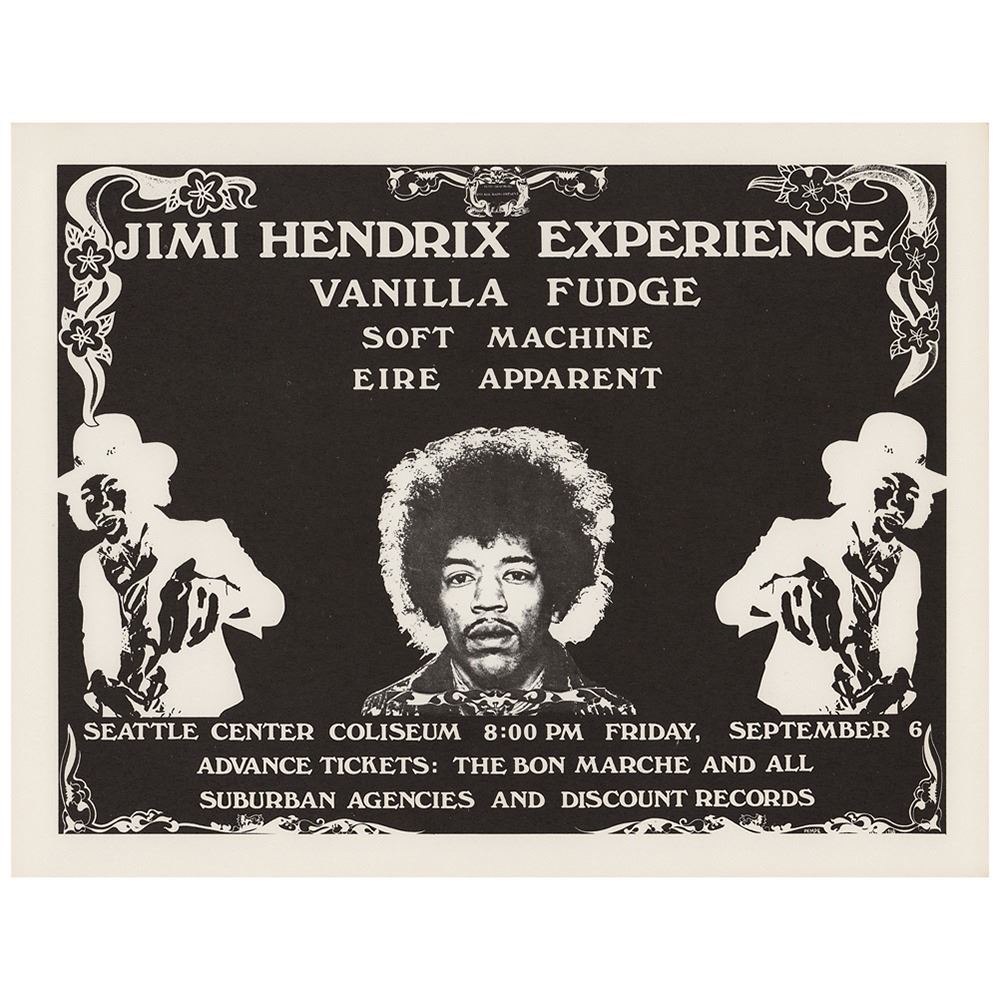 Original 11 x 8.5 handbill for The Jimi Hendrix Experience at the Seattle Center Coliseum on September 6, 1968. Also appearing were Vanilla Fudge, Soft Machine, and Eire Apparent. In fine condition. Hendrix played an 11-song set that night, including 'Purple Haze,' 'Foxy Lady,' and 'Voodoo Child (Slight Return).'