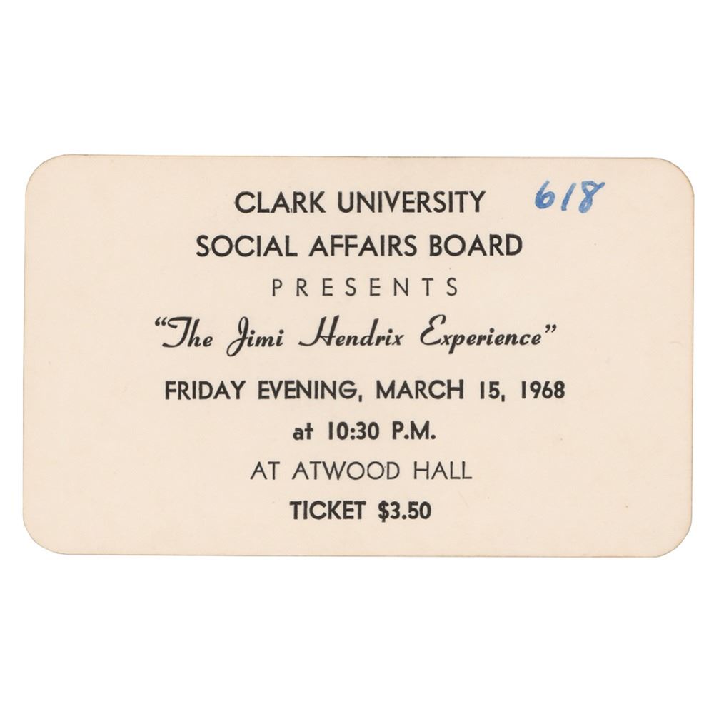 Uncommon original 3.75 x 2.25 admission pass for The Jimi Hendrix Experience at Clark University's Atwood Hall in Worcester, Massachusetts, on March 15, 1968. Annotated "618" in the upper corner. In fine condition. Played as part of his US tour in support of Axis: Bold as Love, this show came a year after Hendrix's memorable performance at the Monterey Pop Festival and a year before Woodstock. Among the classics he played that night were 'Foxey Lady' and 'Purple Haze.'