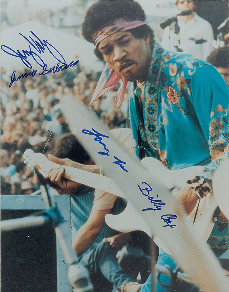 Color glossy 11 x 14 photo of Hendrix on stage in Santa Clara, California, in May of 1969, signed in blue felt tip by band members Billy Cox, Larry Lee, Juma Sultan, and Jerry Velez. In very fine condition. Accompanied by a full letter of authenticity from Roger Epperson/REAL.
