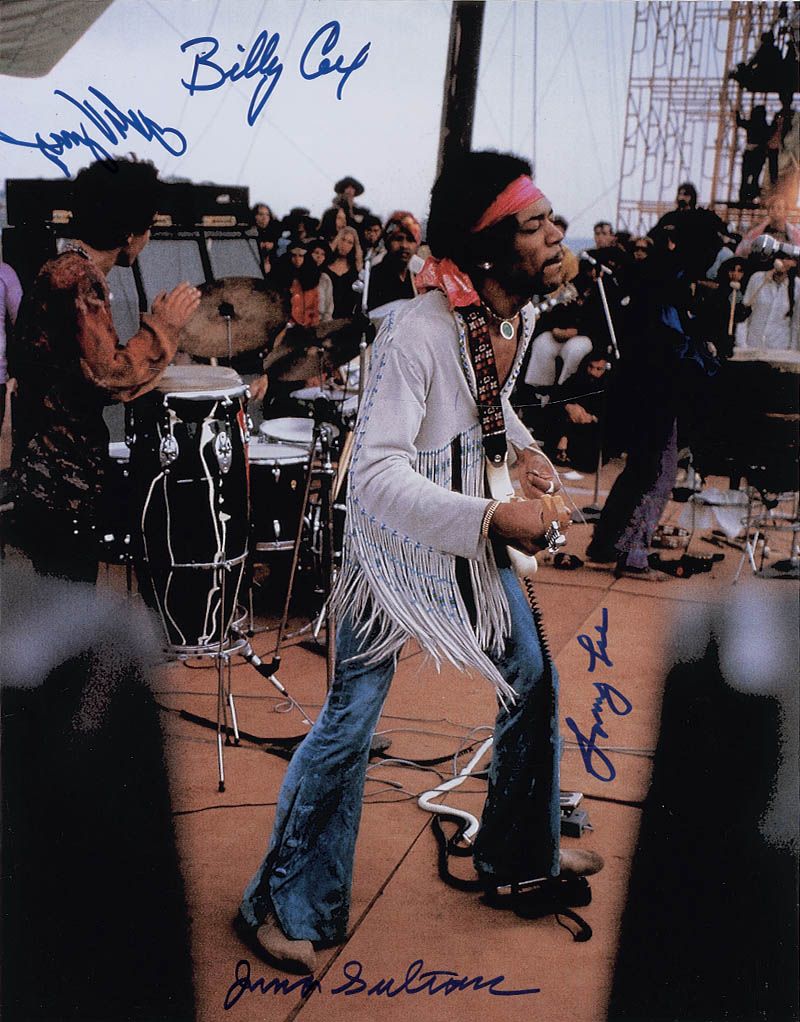 Color glossy 11 x 14 photo of Hendrix at Woodstock, signed in blue felt tip by Gypsy Sun and Rainbows band members Billy Cox, Larry Lee, Juma Sultan, and Jerry Velez. In fine condition.