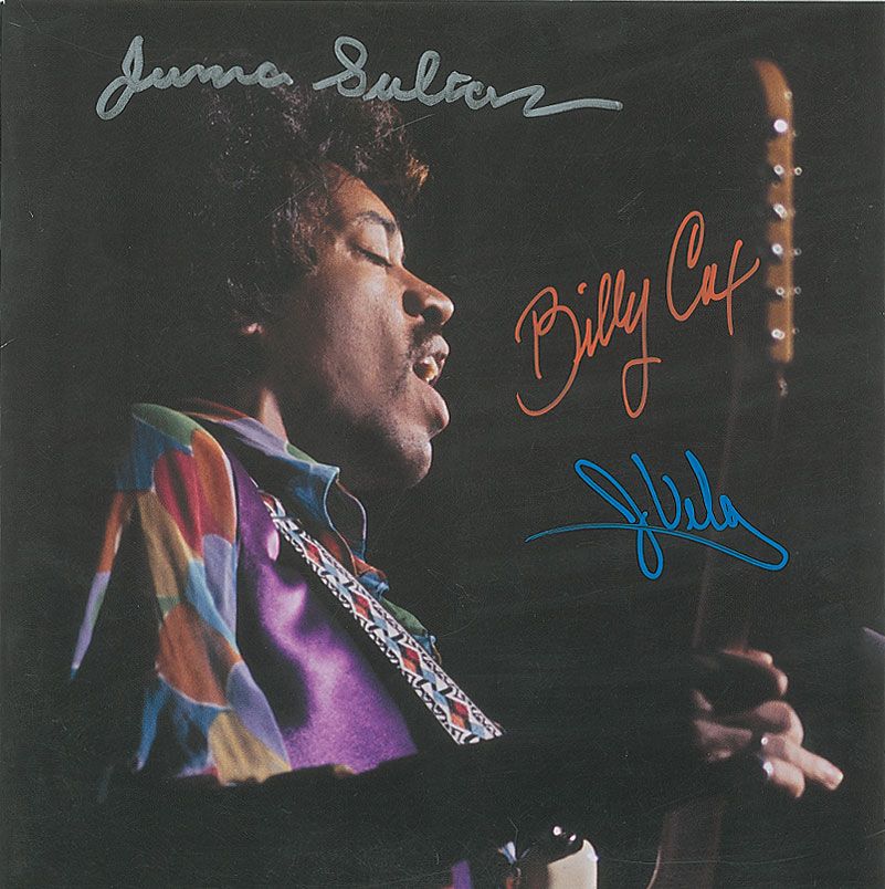 Album booklet from the 2011 remastered edition of Hendrix in the West, 11 x 11, signed on the front cover in various color inks by Billy Cox, Juma Sultan, and Jerry Velez. In fine condition.