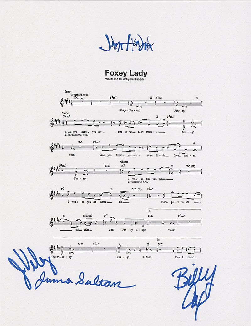 Printout of the first page of sheet music for ‘Foxey Lady,’ on an off-white 8.5 x 11 cardstock sheet, signed in blue felt tip, “Juma Sultan,” “Billy Cox,” “J. Velez.” In fine condition.