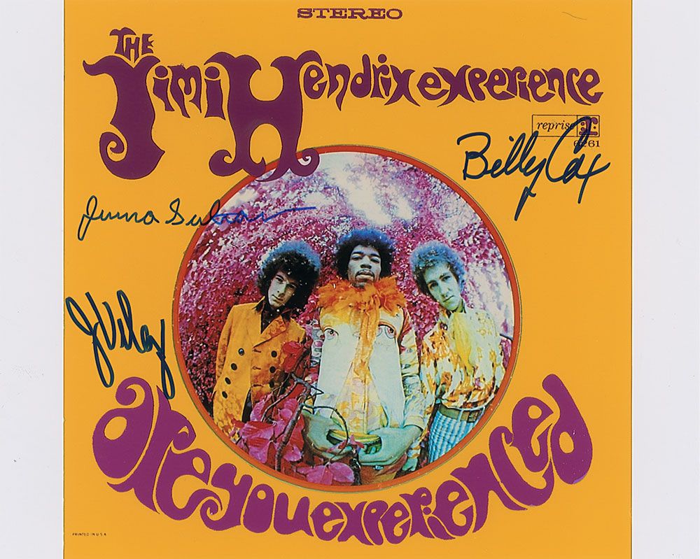 Color glossy 10 x 8 photo of the Are You Experienced album cover, signed in blue felt tip by Billy Cox, Juma Sultan, and Jerry Velez. In very fine condition.