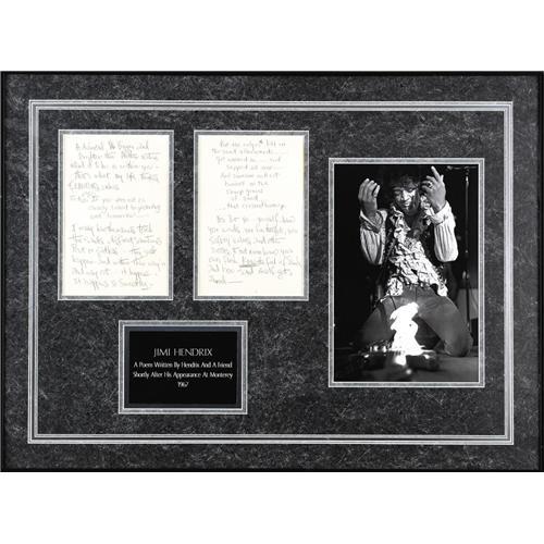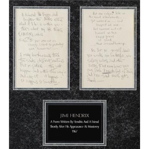 <B>Jimi Hendrix Hand-Written Poem.</B></I> In 1967, the Jimi Hendrix Experience received their first opportunity to break into the American scene when Paul McCartney agreed to promote the Monterey Pop Festival on the condition that the Experience be included in festival. This proved to be a great opportunity for Hendrix, not only because of the large audience that was present at the event, but also because most of the performances were filmed by D. A. Pennebaker and later shown in movie theaters throughout the country as the rockumentary "Monterey Pop," which immortalized the iconic image of Hendrix burning and smashing of his guitar. Featured here is a two-page handwritten poem by Hendrix and his then-girlfriend Kathy Etchingham, written shortly after the festival. It reads in part: "Yes, but you...yourself, have your words, your free thought, your safety valves and other buttons to not even have your own flesh know the feel of sand and how sand itself gets abused." The pages are matted and framed along with a classic 8" x 10" b&w photo of Hendrix kneeling over a flaming guitar, to an overall size of 22.25" x 30.25". An awesome, unique piece.