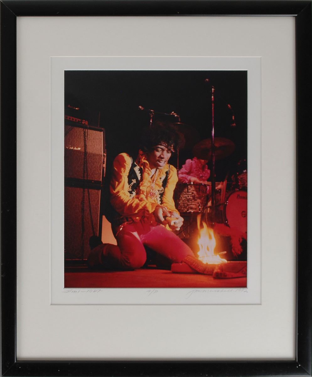 Vibrantly colored 10.25 x 12.25 print of Jim Marshall’s photograph of Jimi Hendrix squirting lighter fluid onto his burning Stratocaster during the finale of his performance at the 1967 Monterey Pop Festival. Doubled-matted and framed, with the photographer signing on the mat in pencil, “Jimi—1967—A/P, Jim Marshall—1992.” In fine condition. From Hendrix at Monterey to Cash at San Quentin, legendary photographer Jim Marshall has managed to capture many of rock’s most iconic names during some of their most mythical moments. A vivid depiction of Hendrix’s incendiary outro to ‘Wild Thing.’